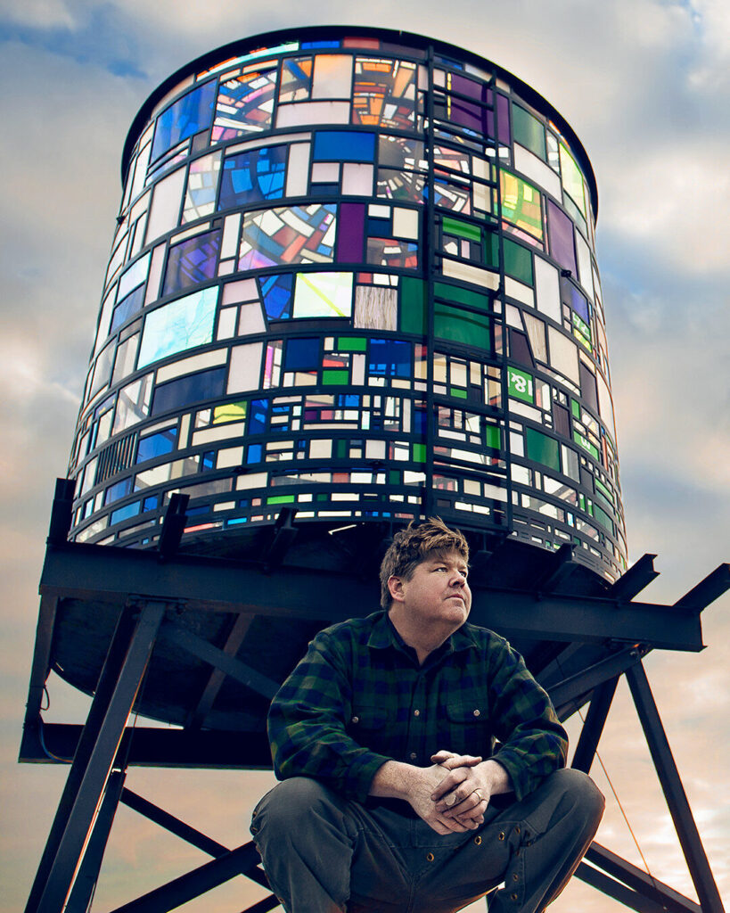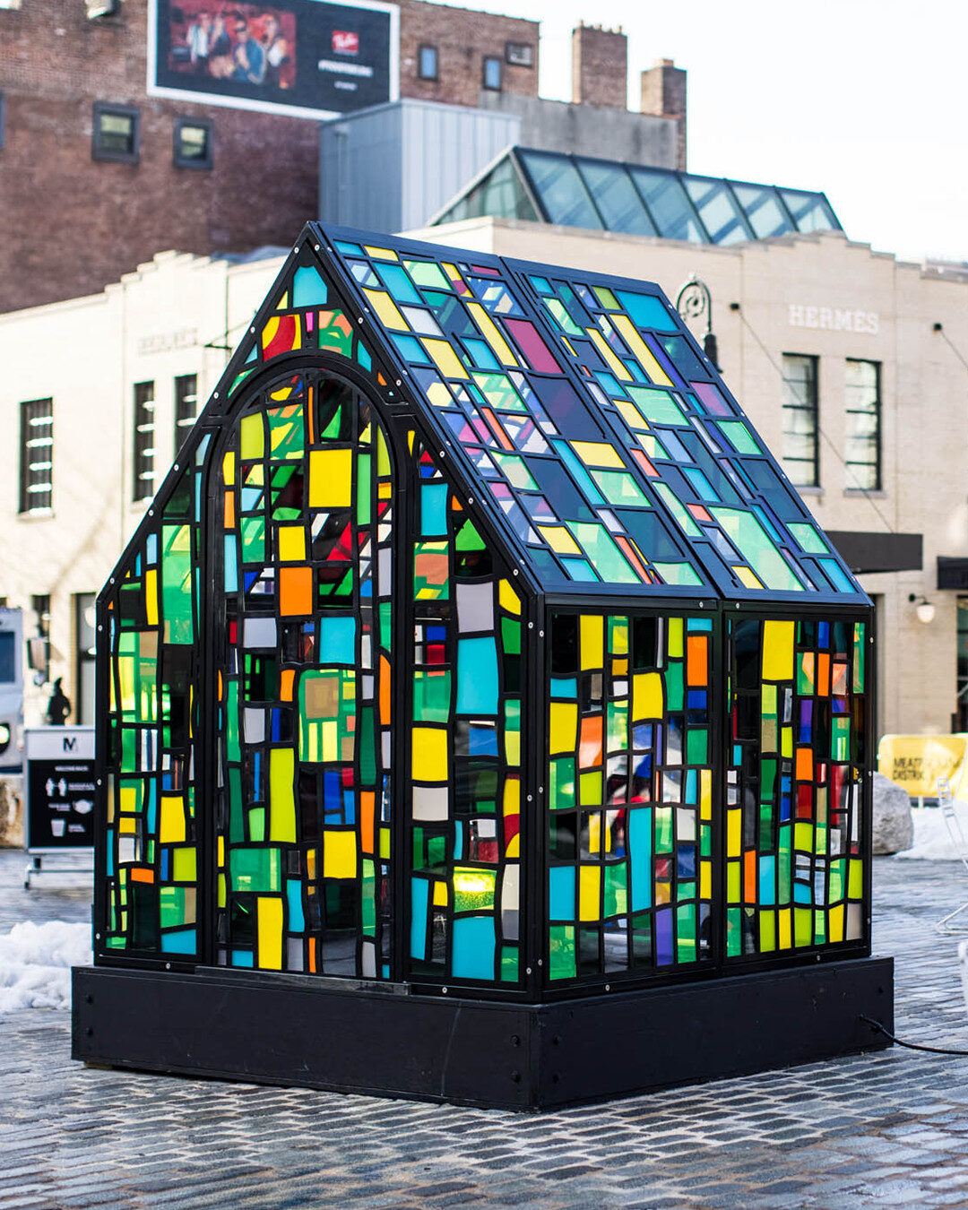“There’s a nature to the way Kyle uses hide that’s similar to the quilting work I create. When I finally met up with Kyle in Austin, it was wild! I watched mechanized knives carefully map the material, then watched his team hand-build each design with a care and thoughtfulness that felt familiar to me. And the work caught the light a lot like my glass.” – Tom Fruin
