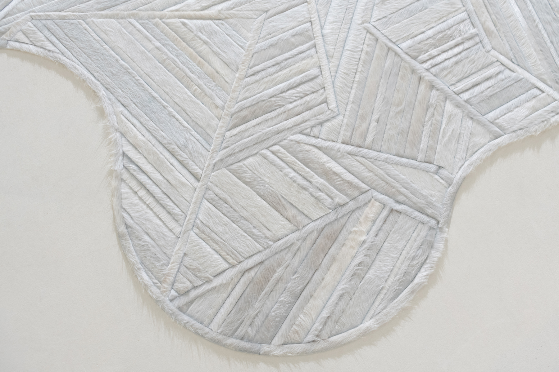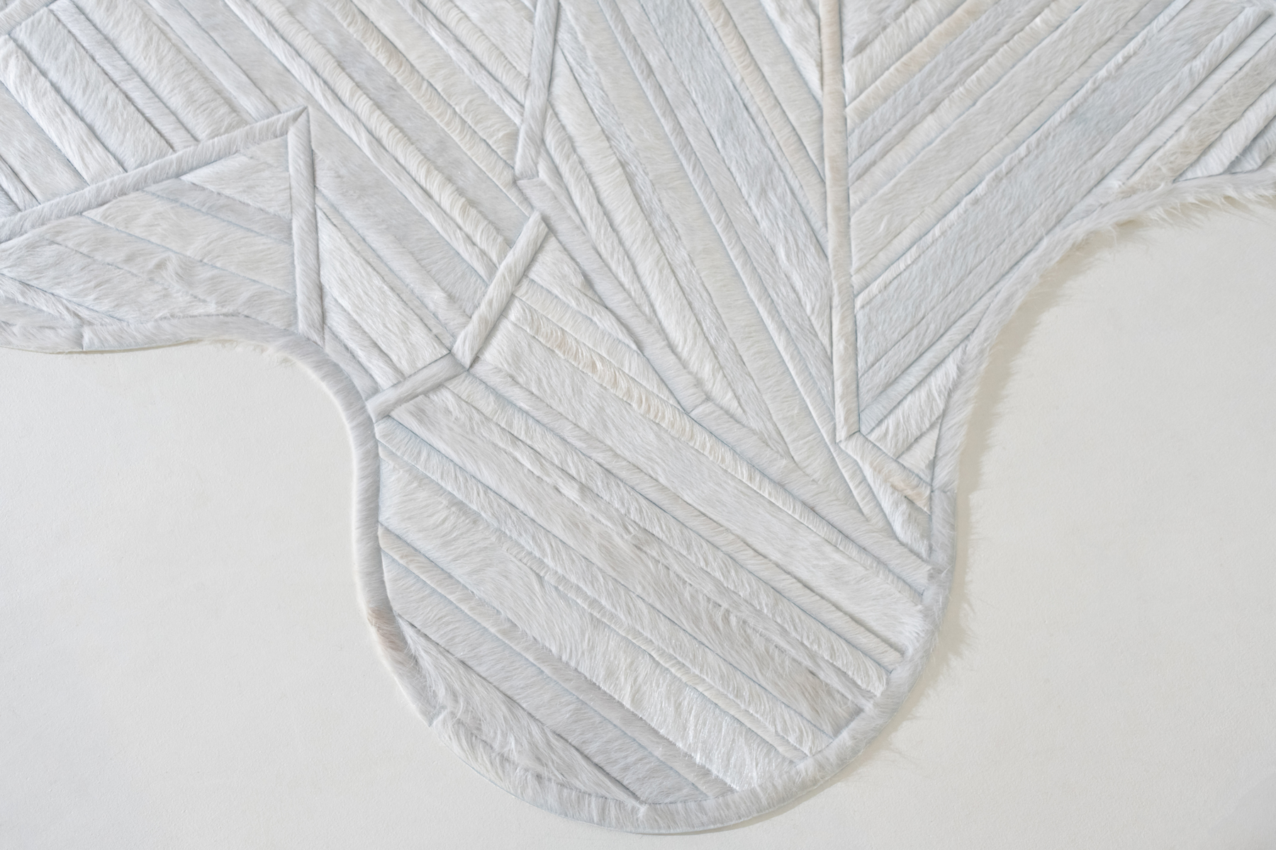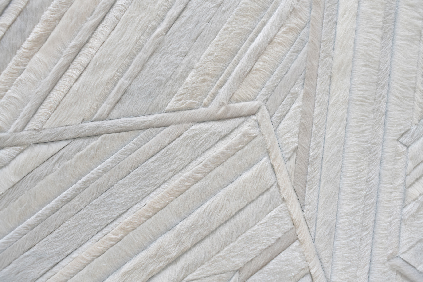 Aerials encompasses aerodynamic, linear forms through playful yet precise pattern arrangement. The design’s intricately layered strips of hide are enveloped in thin borders, forming abstract, angular shapes that overlap one another.