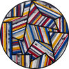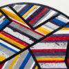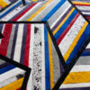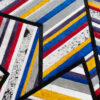 Aerials encompasses aerodynamic, linear forms through playful yet precise pattern arrangement. The design’s intricately layered strips of hide are enveloped in thin borders, forming abstract, angular shapes that overlap one another.