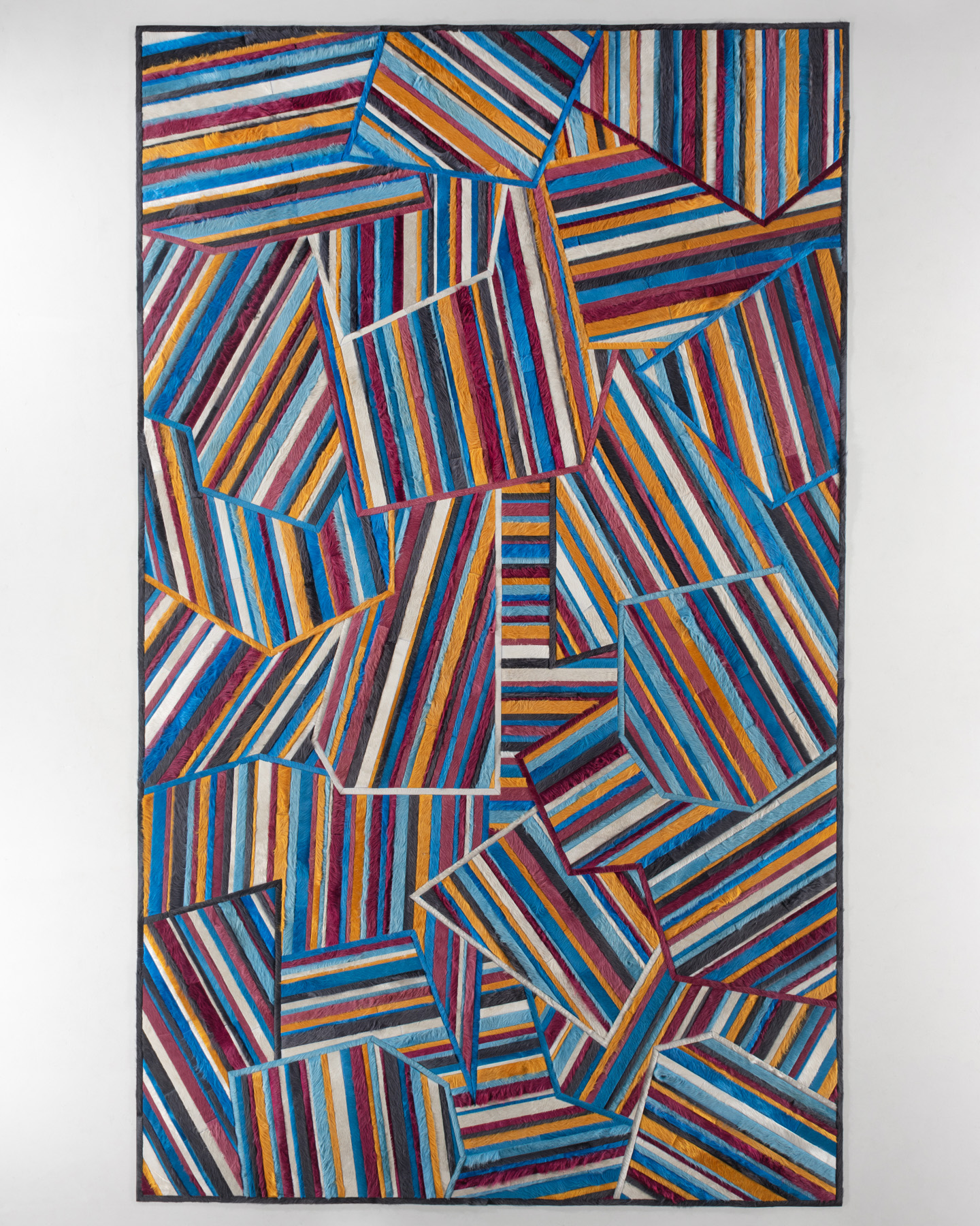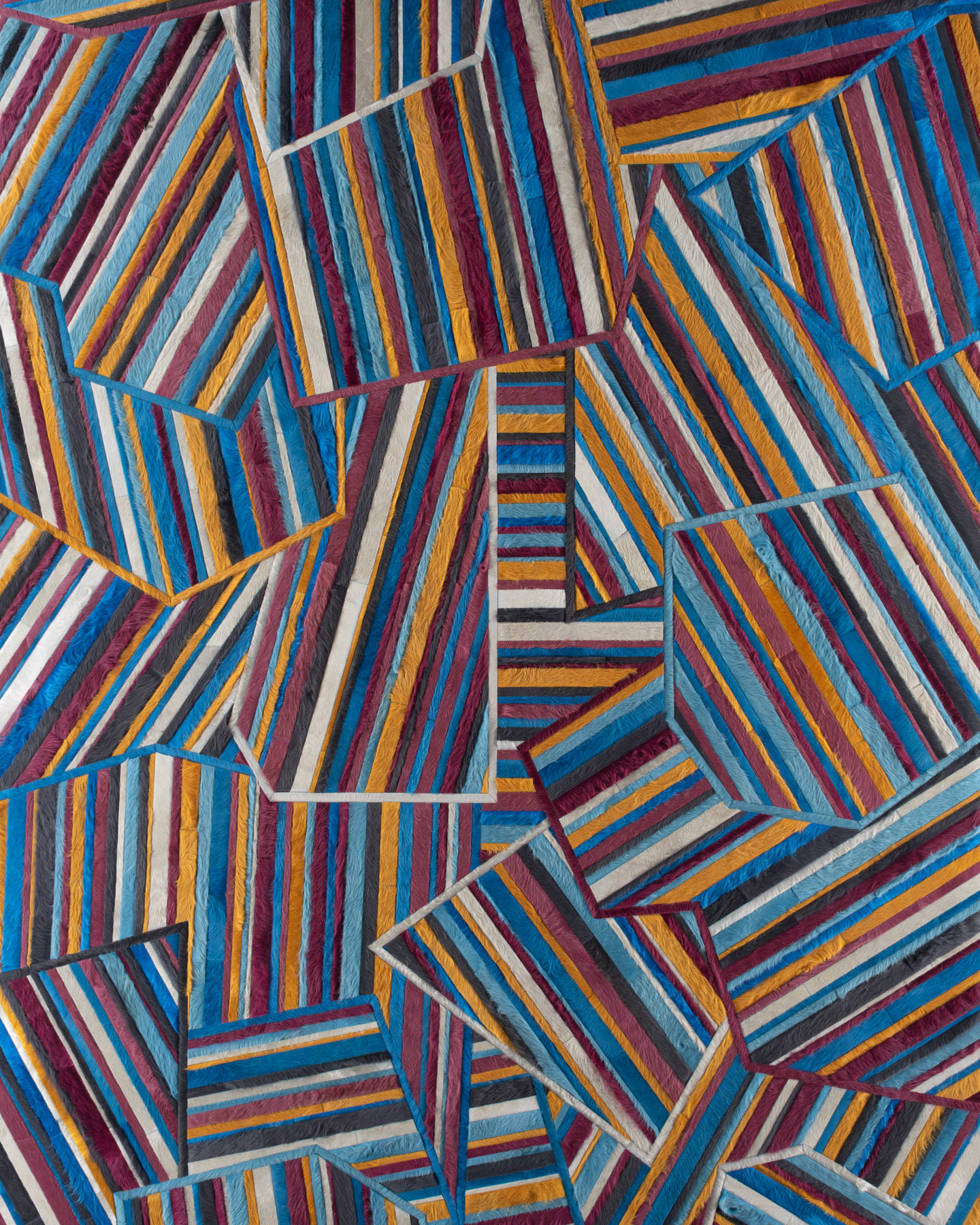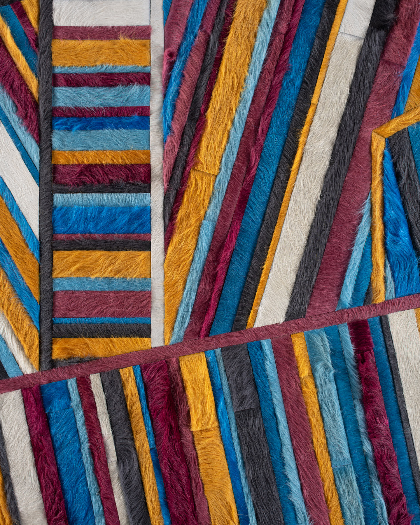 Aerials encompasses aerodynamic, linear forms through playful yet precise pattern arrangement. The design’s intricately layered strips of hide are enveloped in thin borders, forming abstract, angular shapes that overlap one another.