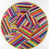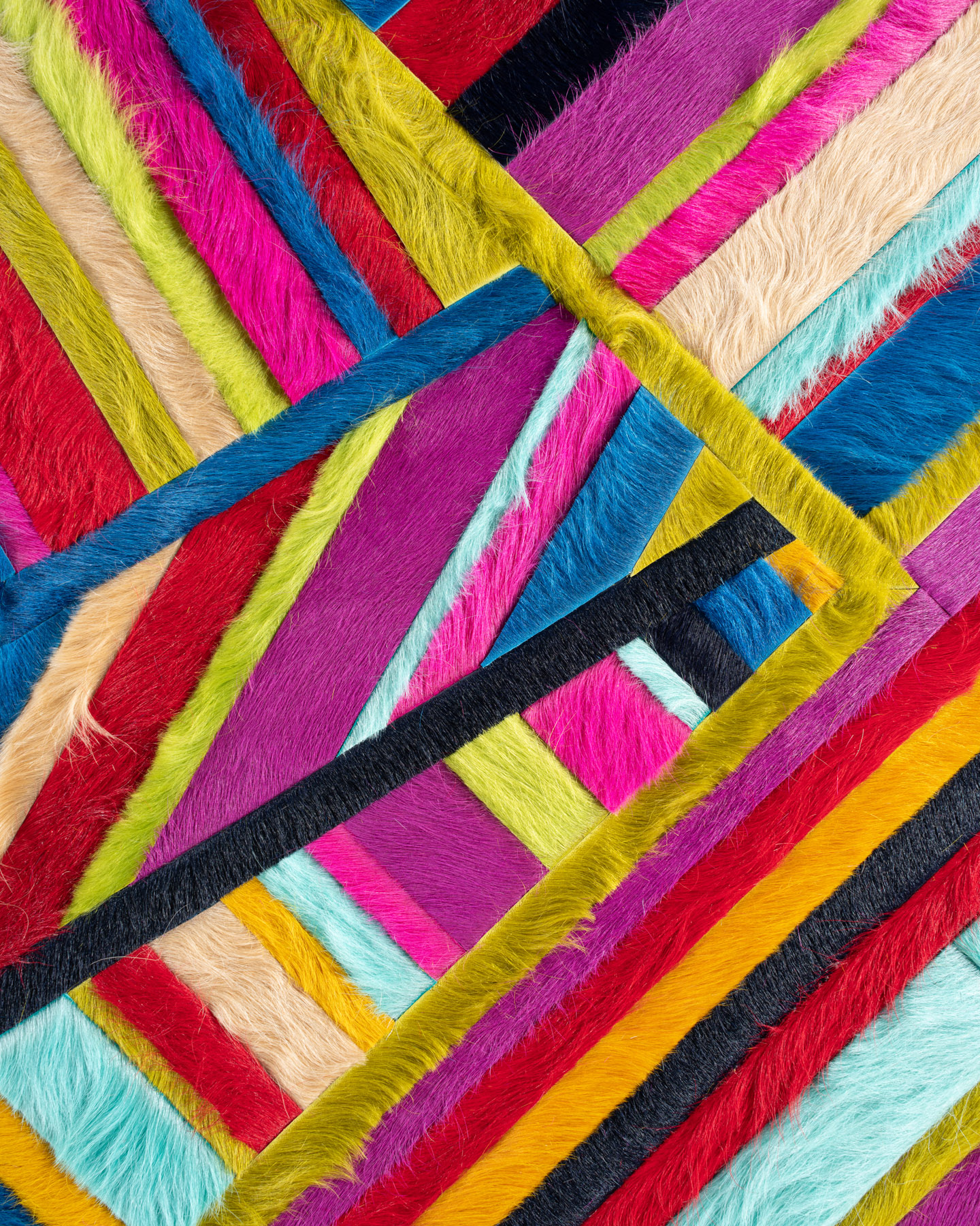Aerials encompasses aerodynamic, linear forms through playful yet precise pattern arrangement. The design’s intricately layered strips of hide are enveloped in thin borders, forming abstract, angular shapes that overlap one another.