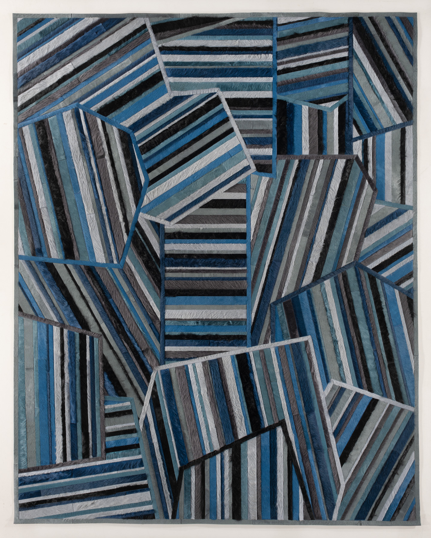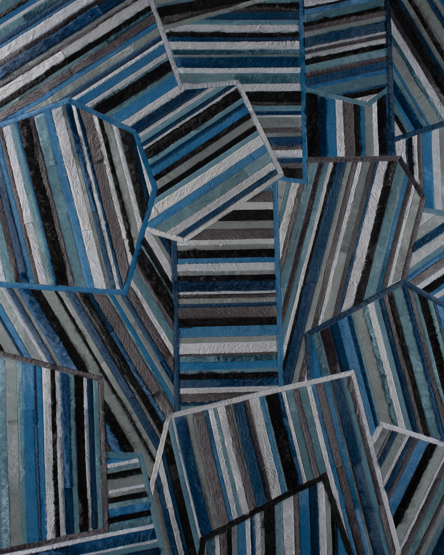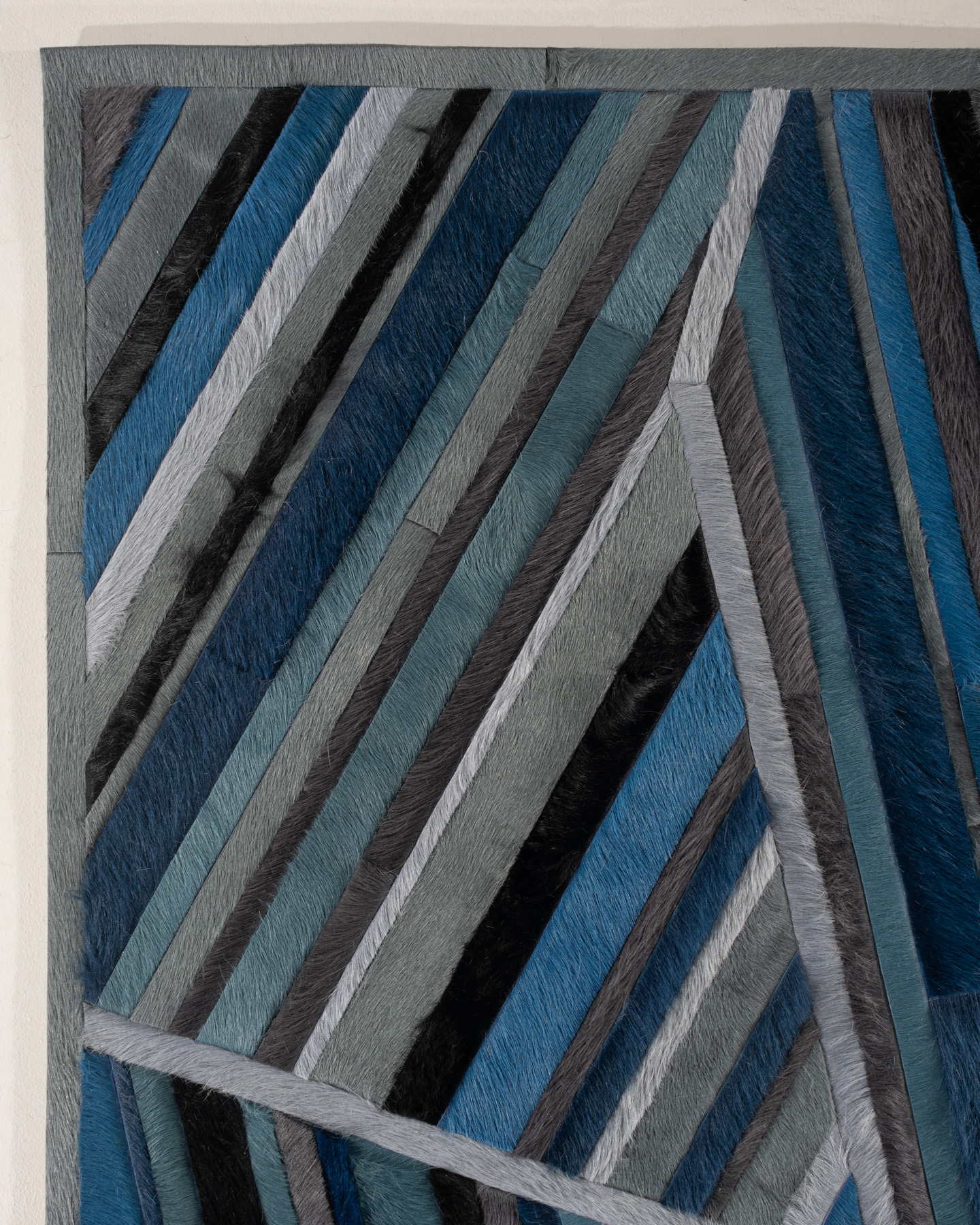 Aerials encompasses aerodynamic, linear forms through playful yet precise pattern arrangement. The design’s intricately layered strips of hide are enveloped in thin borders, forming abstract, angular shapes that overlap one another.