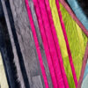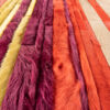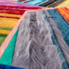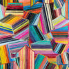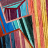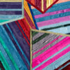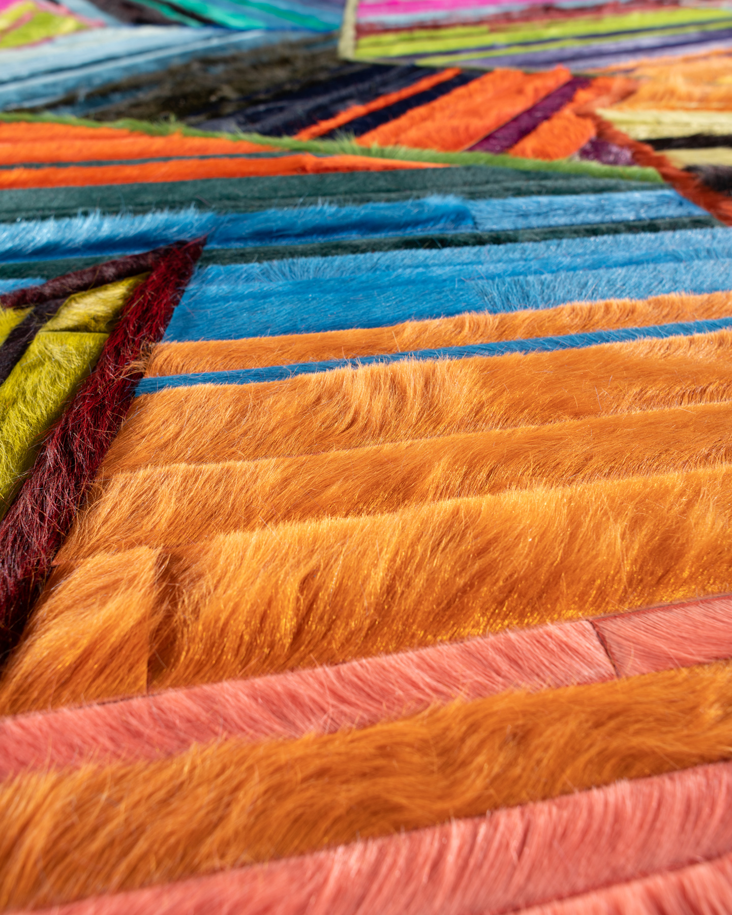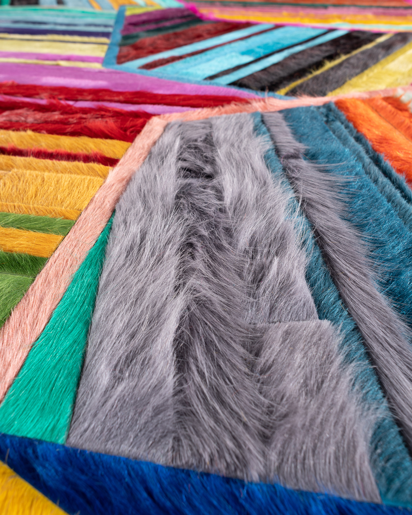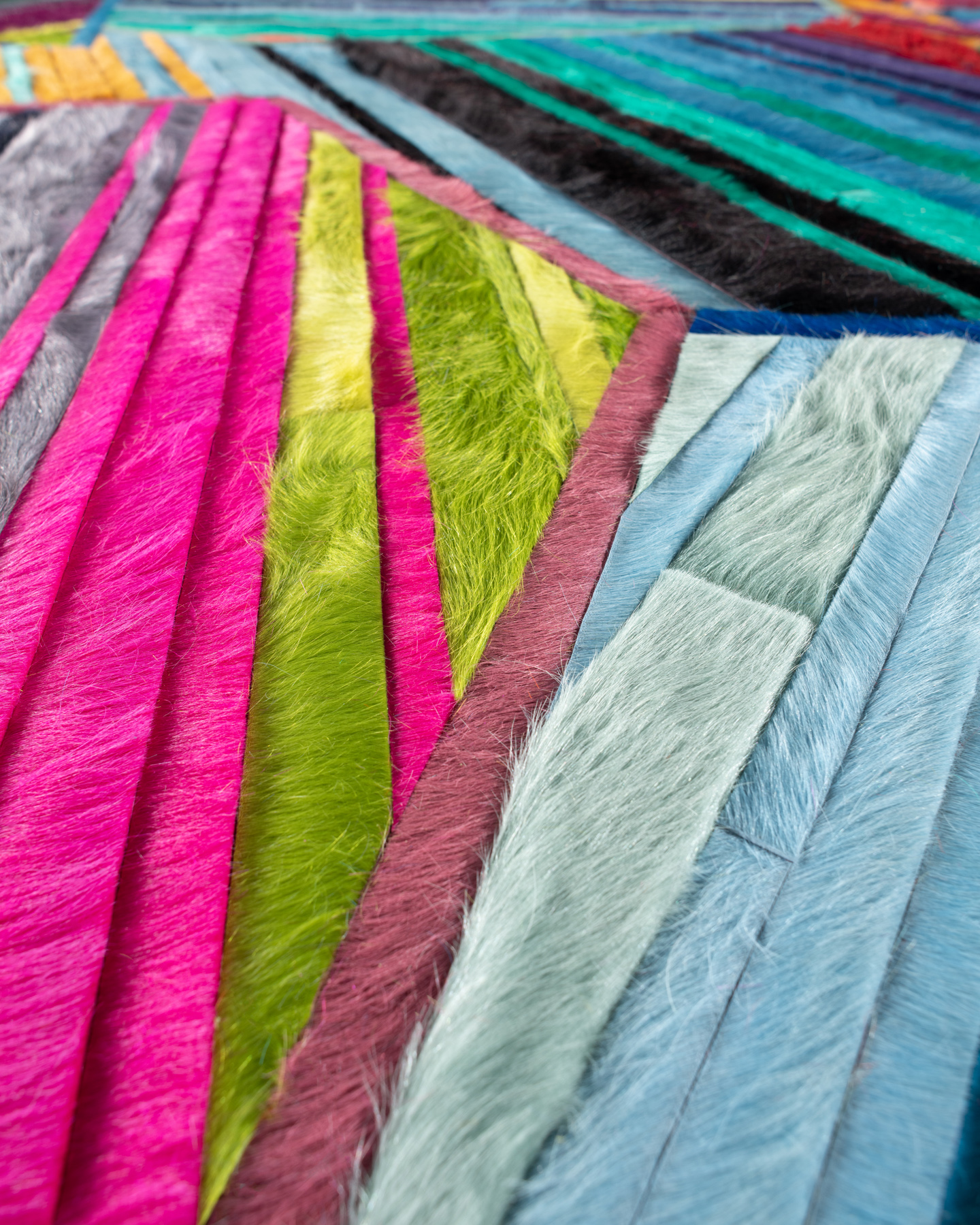 Aerials encompasses aerodynamic, linear forms through playful yet precise pattern arrangement. The design’s intricately layered strips of hide are enveloped in thin borders, forming abstract, angular shapes that overlap one another.