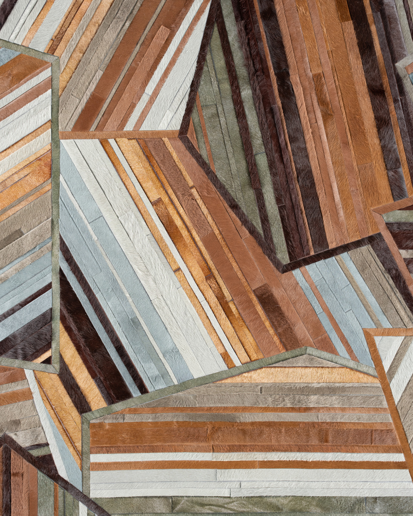 Aerials encompasses aerodynamic, linear forms through playful yet precise pattern arrangement. The design’s intricately layered strips of hide are enveloped in thin borders, forming abstract, angular shapes that overlap one another.