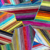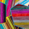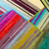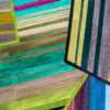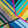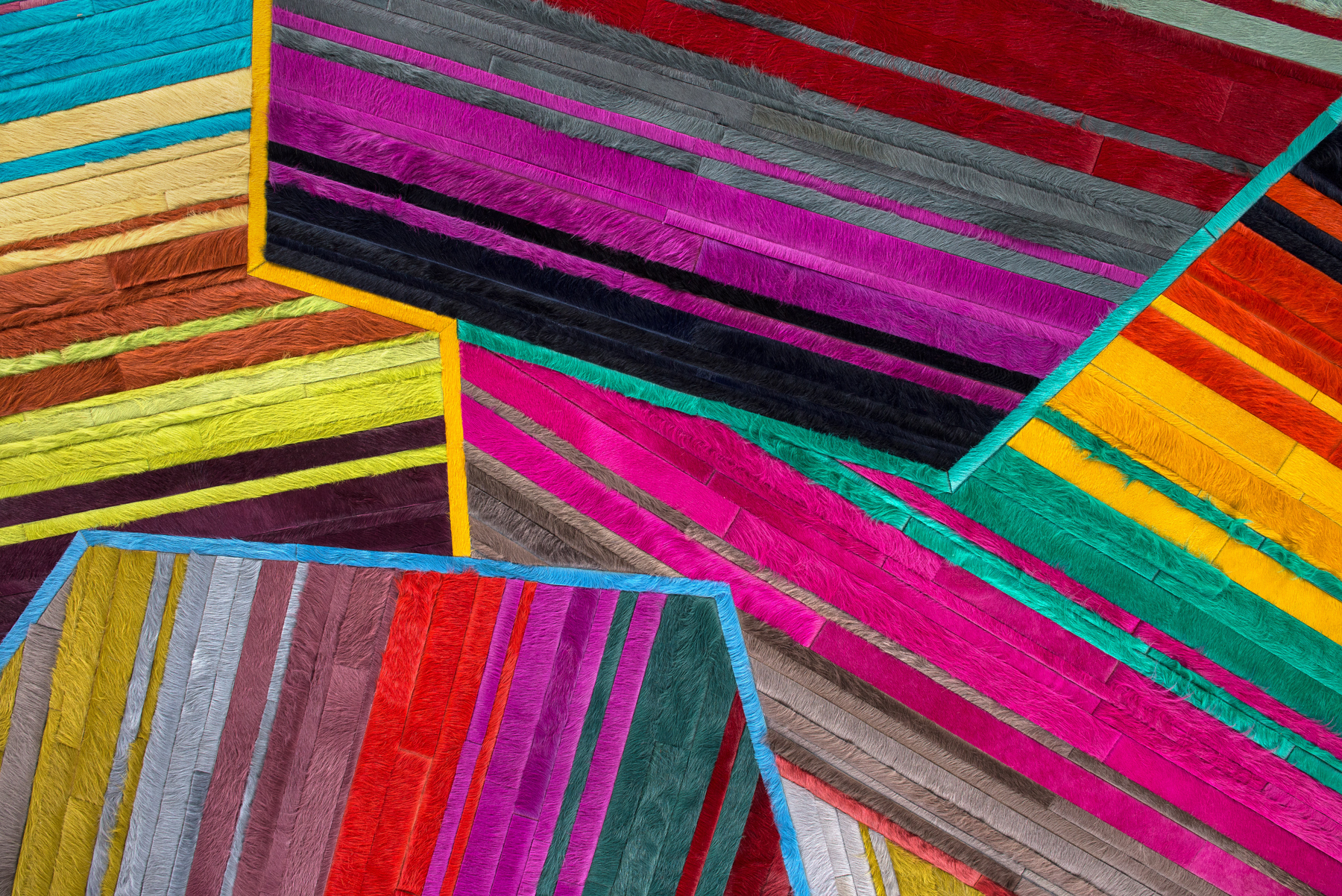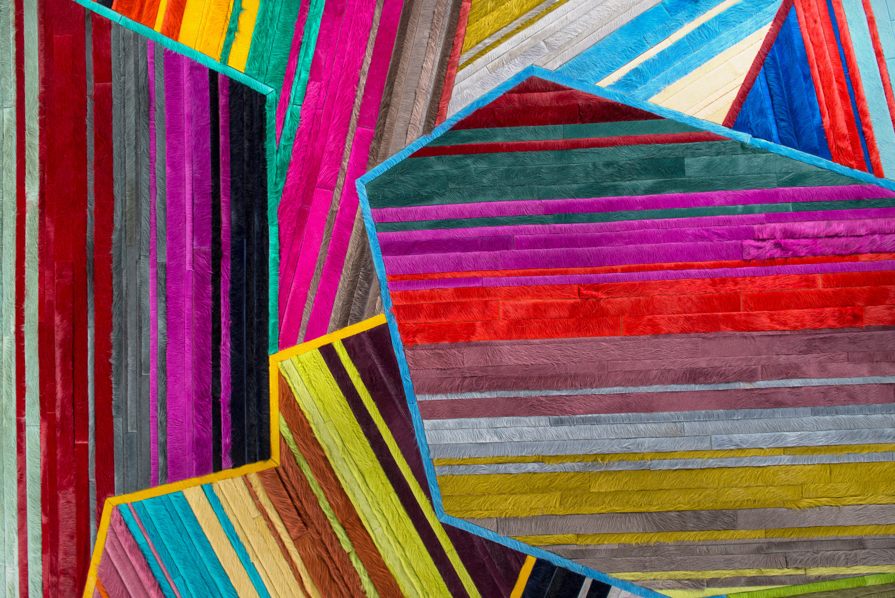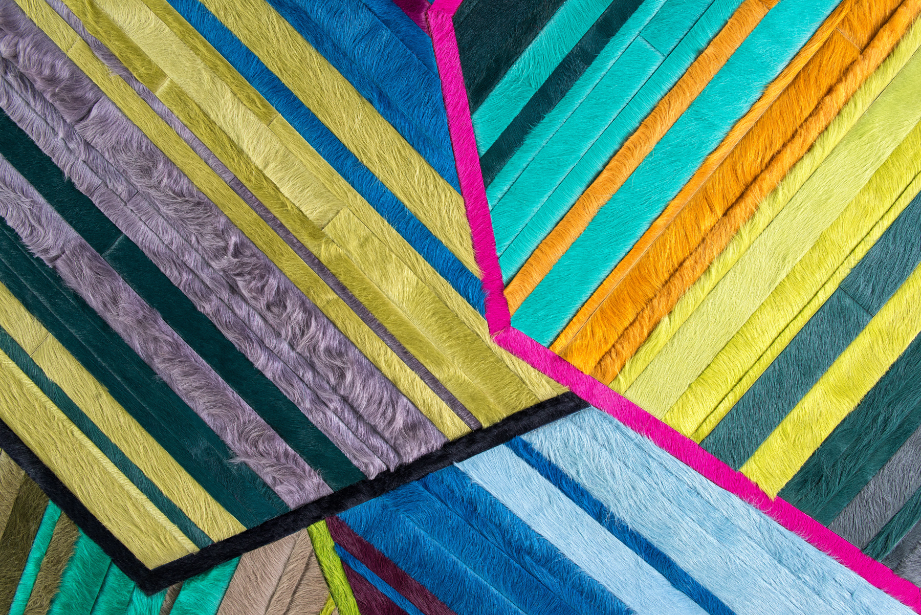 Aerials encompasses aerodynamic, linear forms through playful yet precise pattern arrangement. The design’s intricately layered strips of hide are enveloped in thin borders, forming abstract, angular shapes that overlap one another.