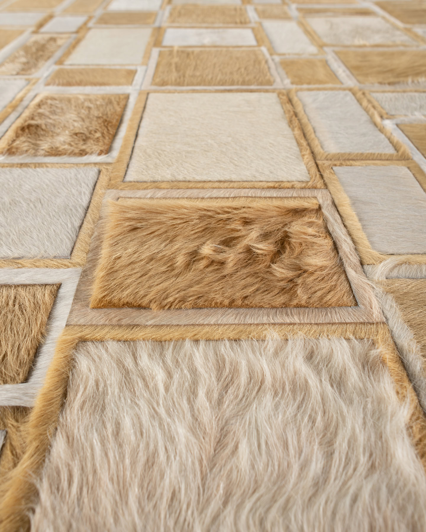 Confusion was originally developed for a modern project in Hong Kong, using varying sizes of banded strips of hide in a grid to create a modern, geometric composition. The arrangement has since been adjusted to explore a sophisticated running band layout, resulting in a contemporary, fresh design.