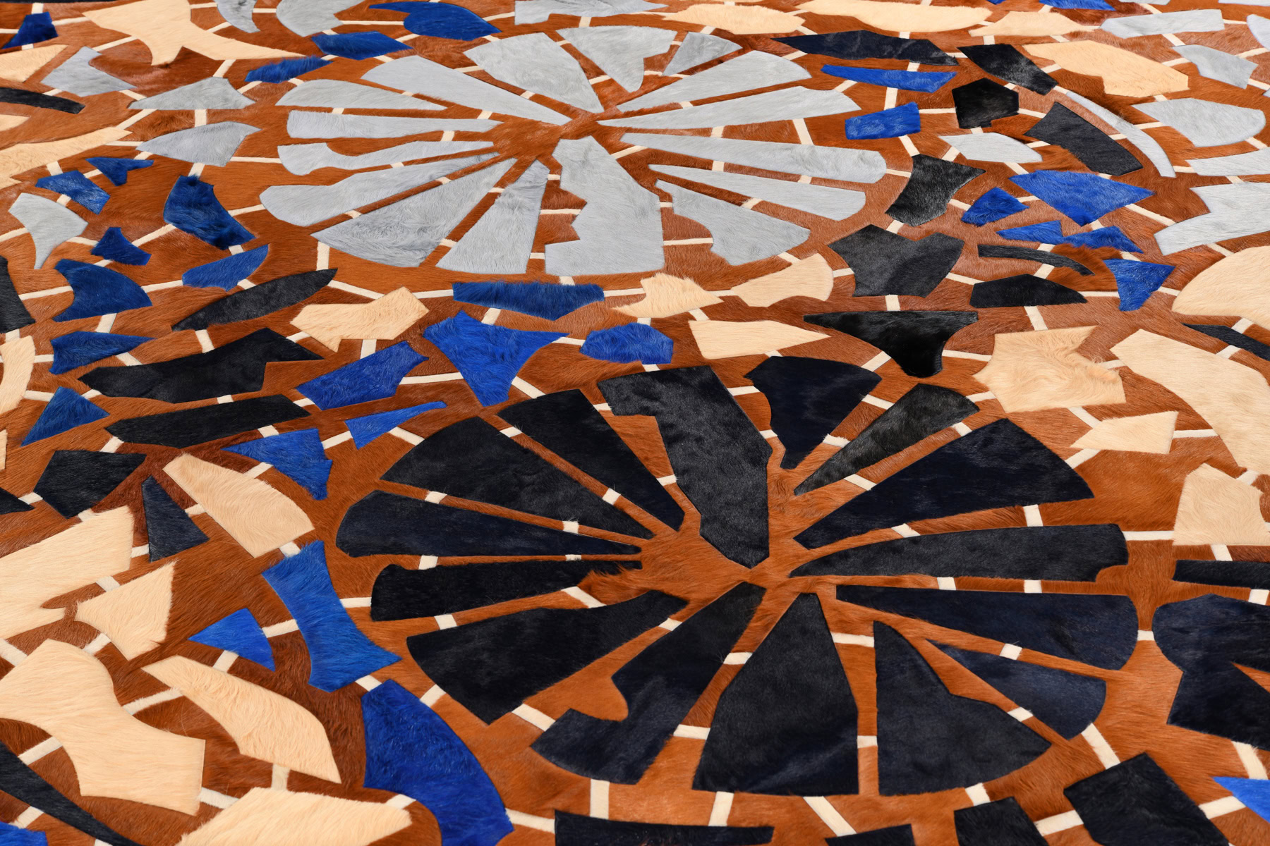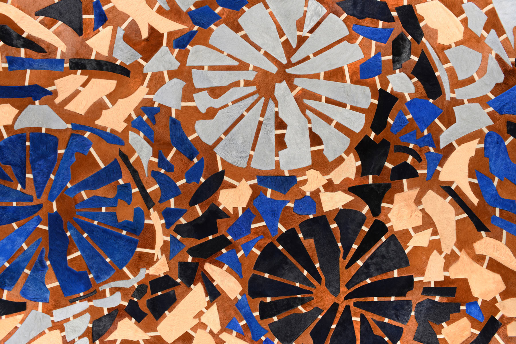 Like all in the Abidemi Series, Element III showcases sporadically placed, angular shapes interlocked with one another through thin strips of hide. The design itself features three distinct flower shapes with broken elements radiating around the trio.