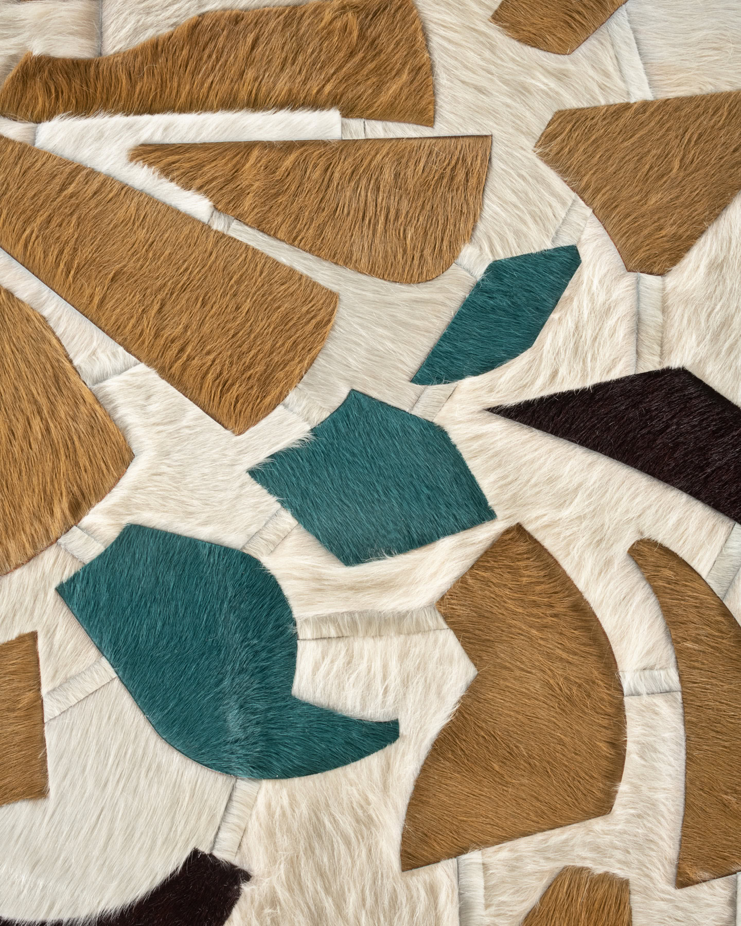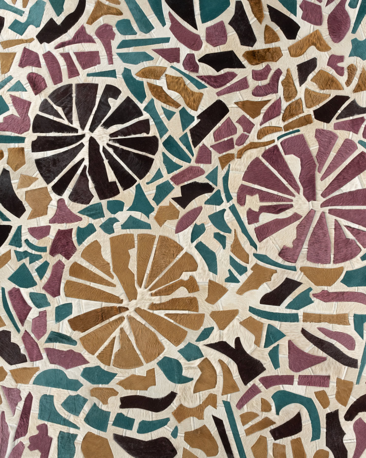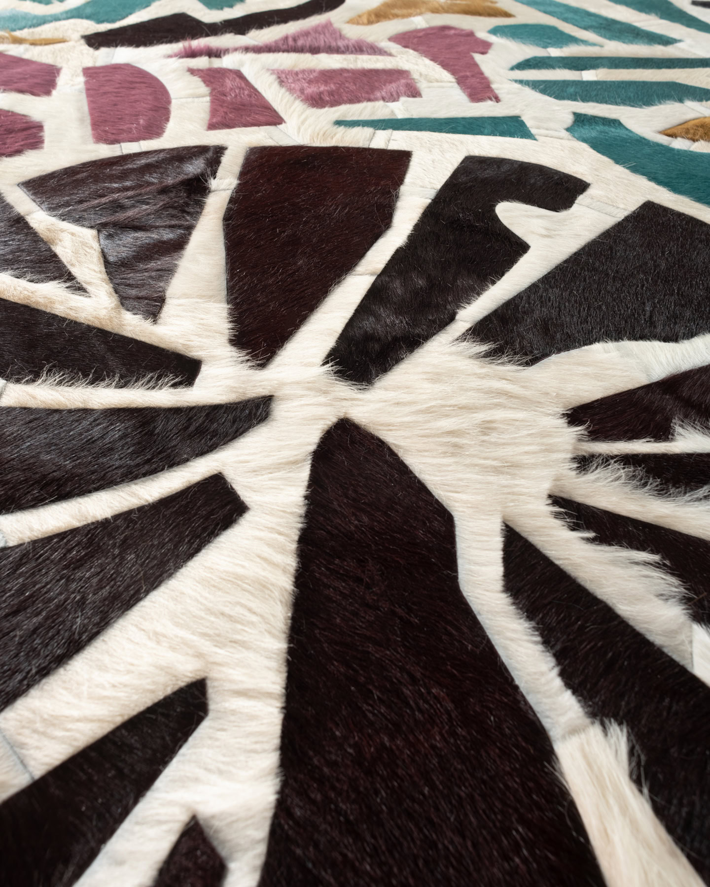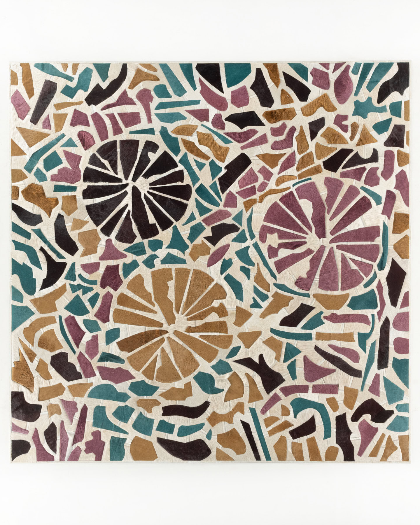 Like all in the Abidemi Series, Element III showcases sporadically placed, angular shapes interlocked with one another through thin strips of hide. The design itself features three distinct flower shapes with broken elements radiating around the trio.