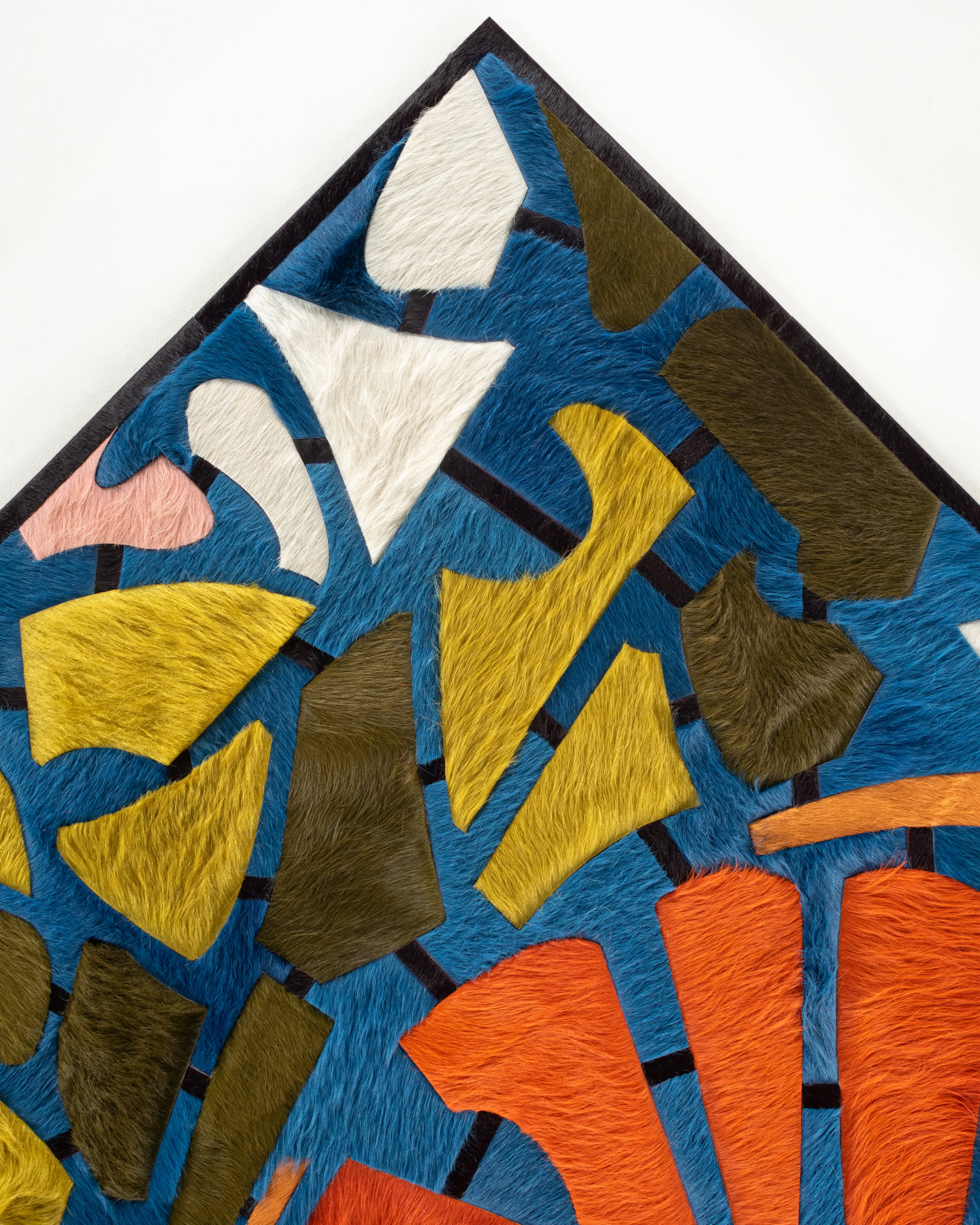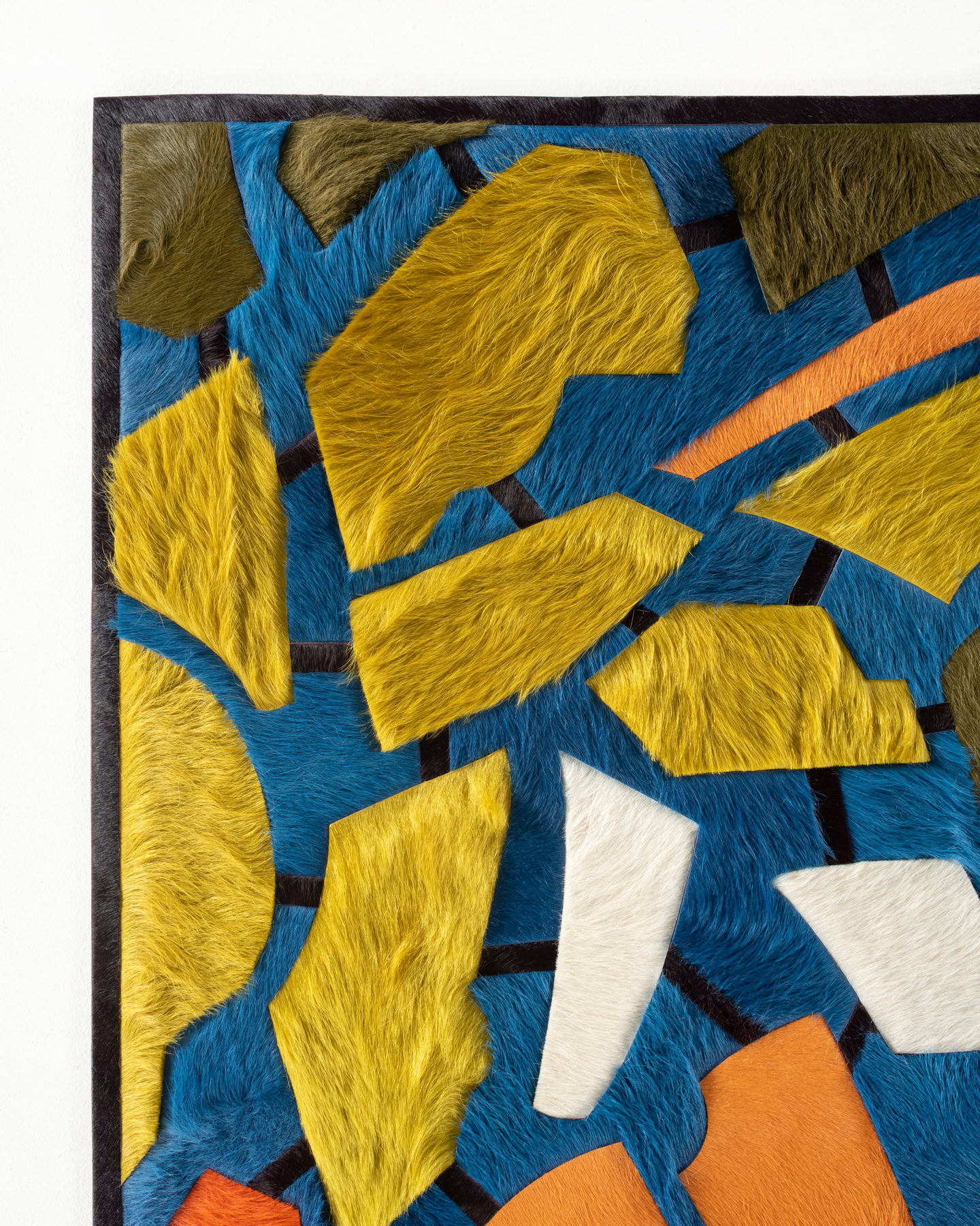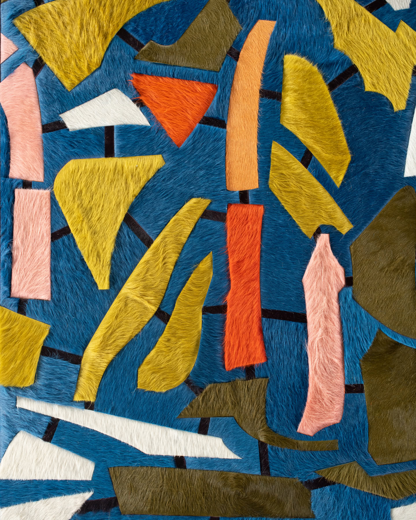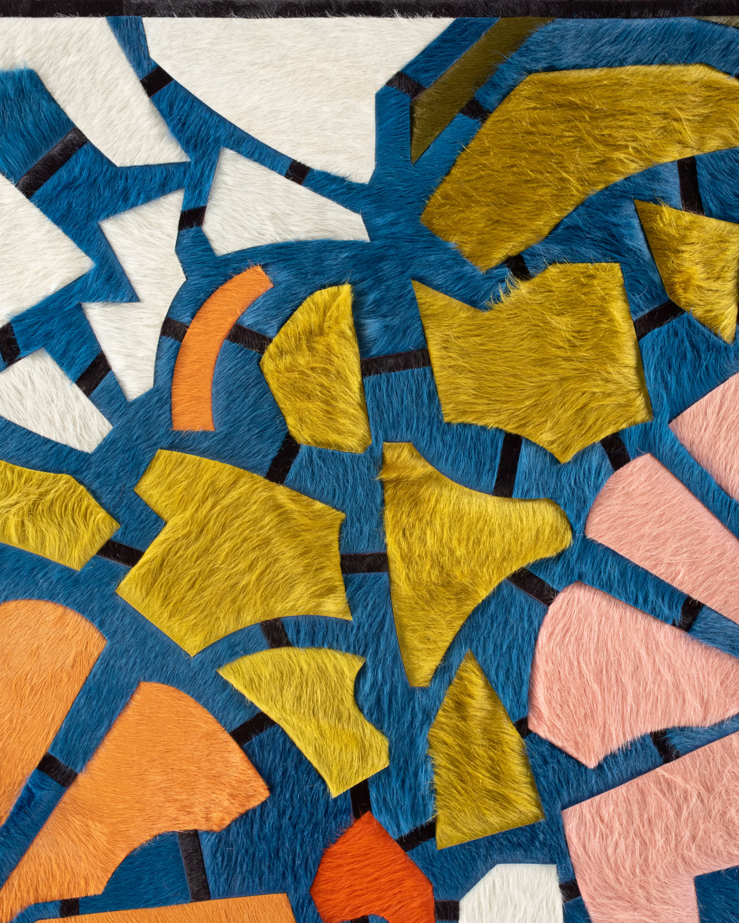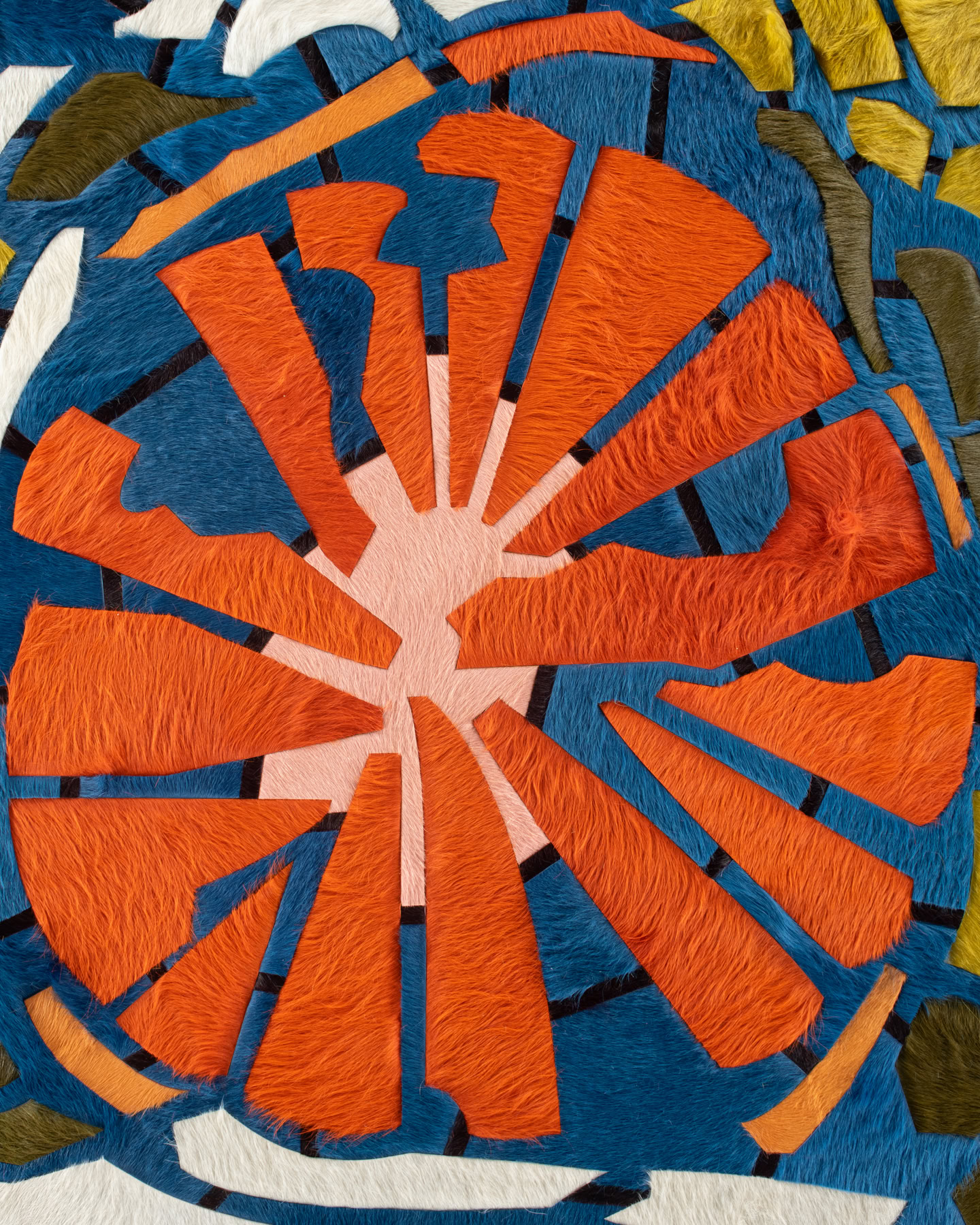 Like all in the Abidemi Series, Element III showcases sporadically placed, angular shapes interlocked with one another through thin strips of hide. The design itself features three distinct flower shapes with broken elements radiating around the trio.