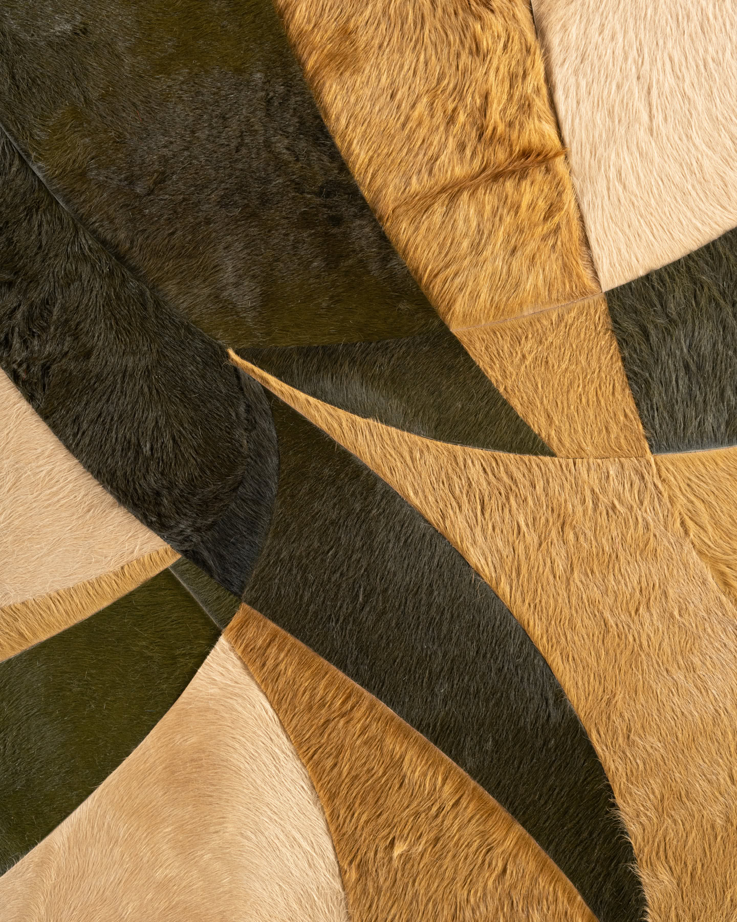 Popularly conceived as a round rug, Luna evokes the image of a craterous moon in the night sky. Large cuts of hide are carefully placed, creating the individually stylistic and organic shapes that give Luna balance and congruity.