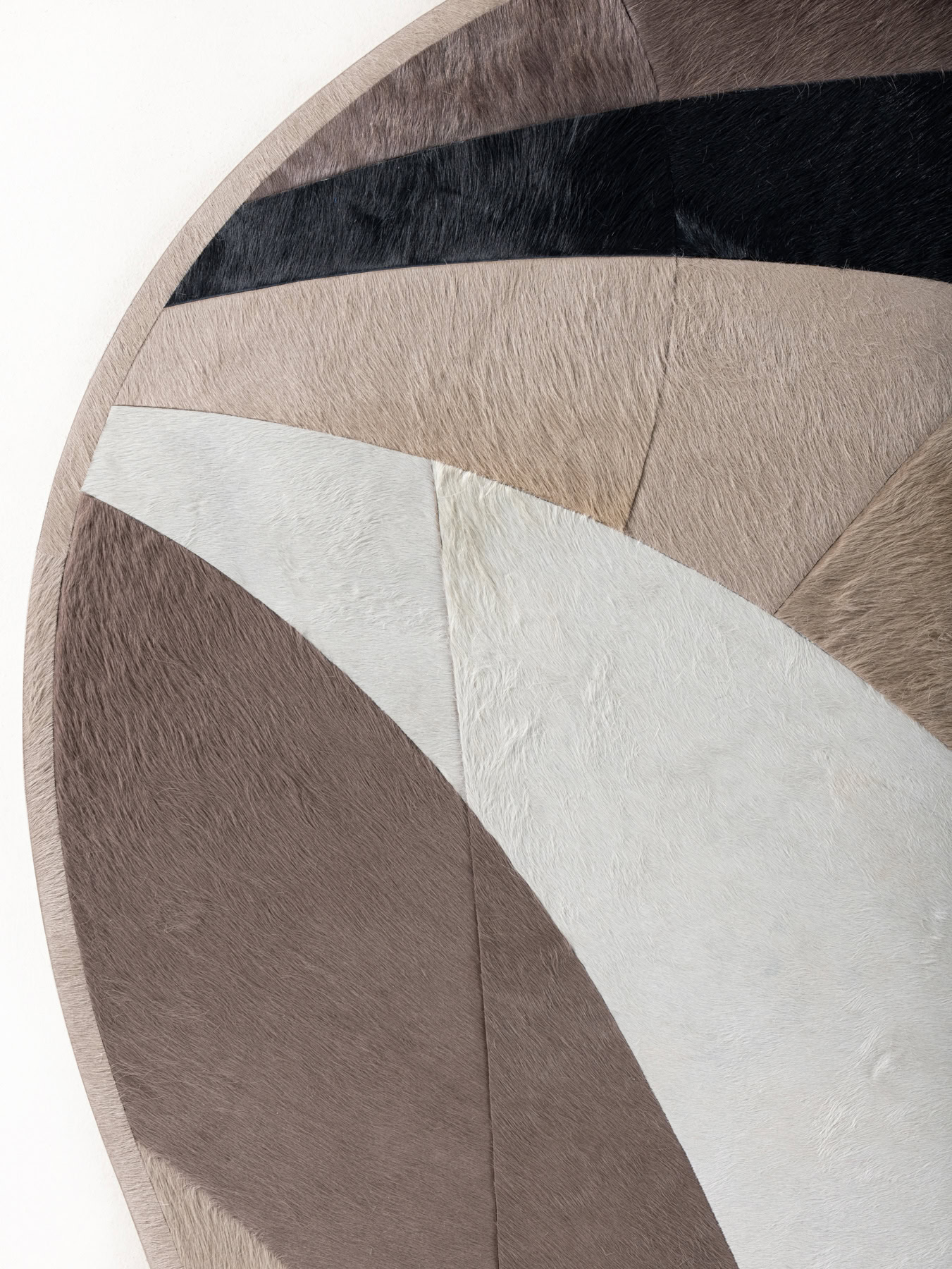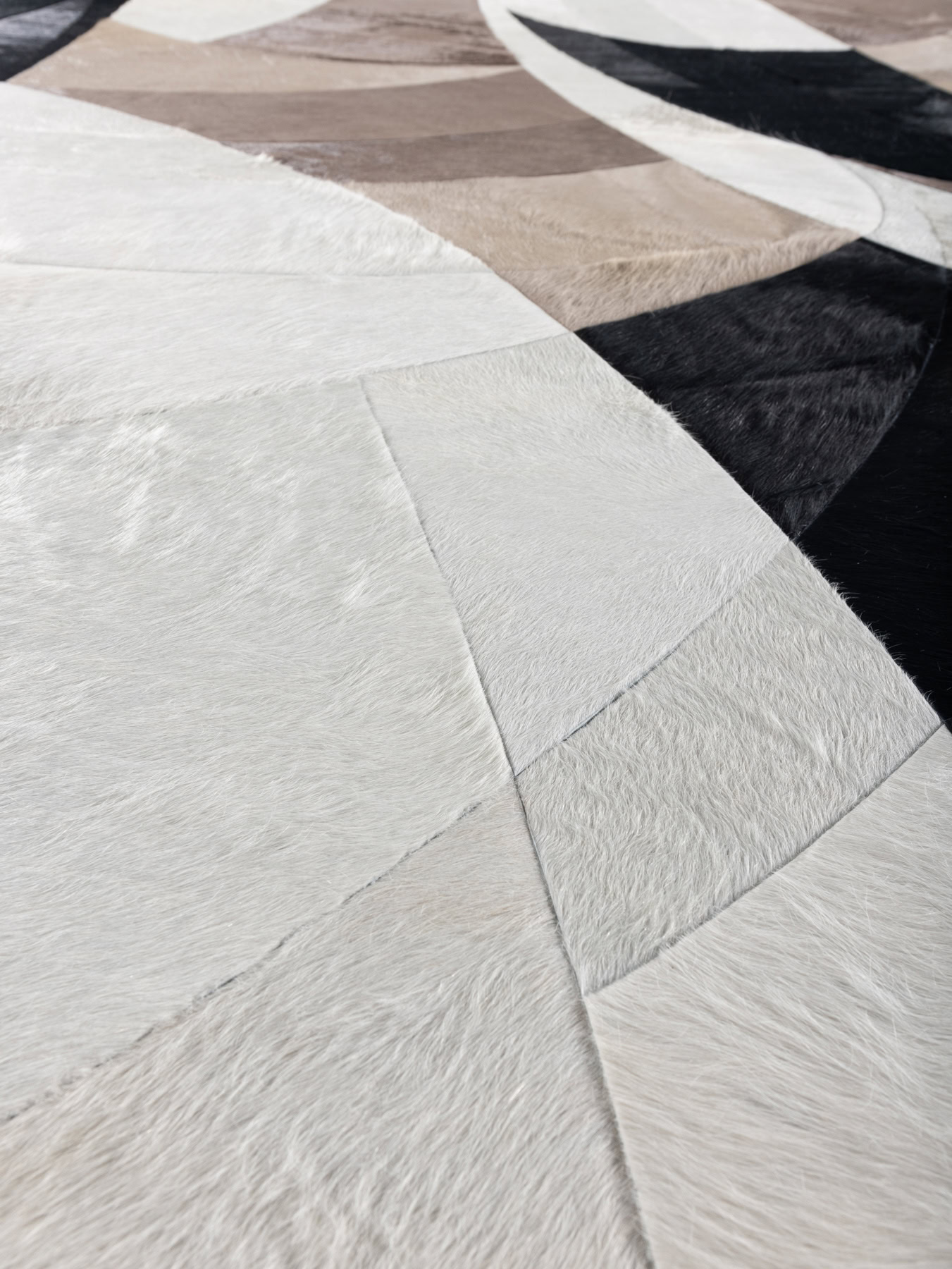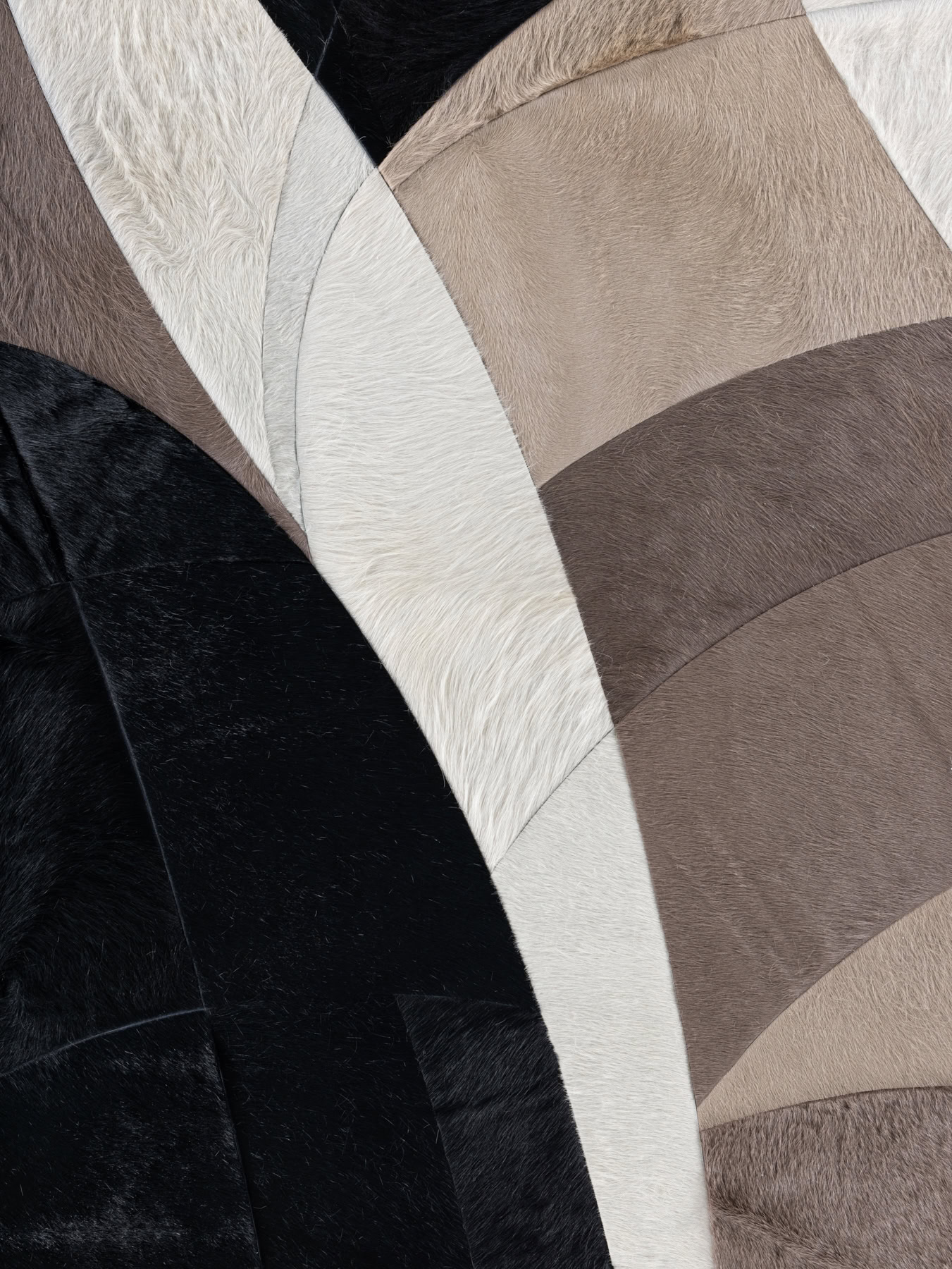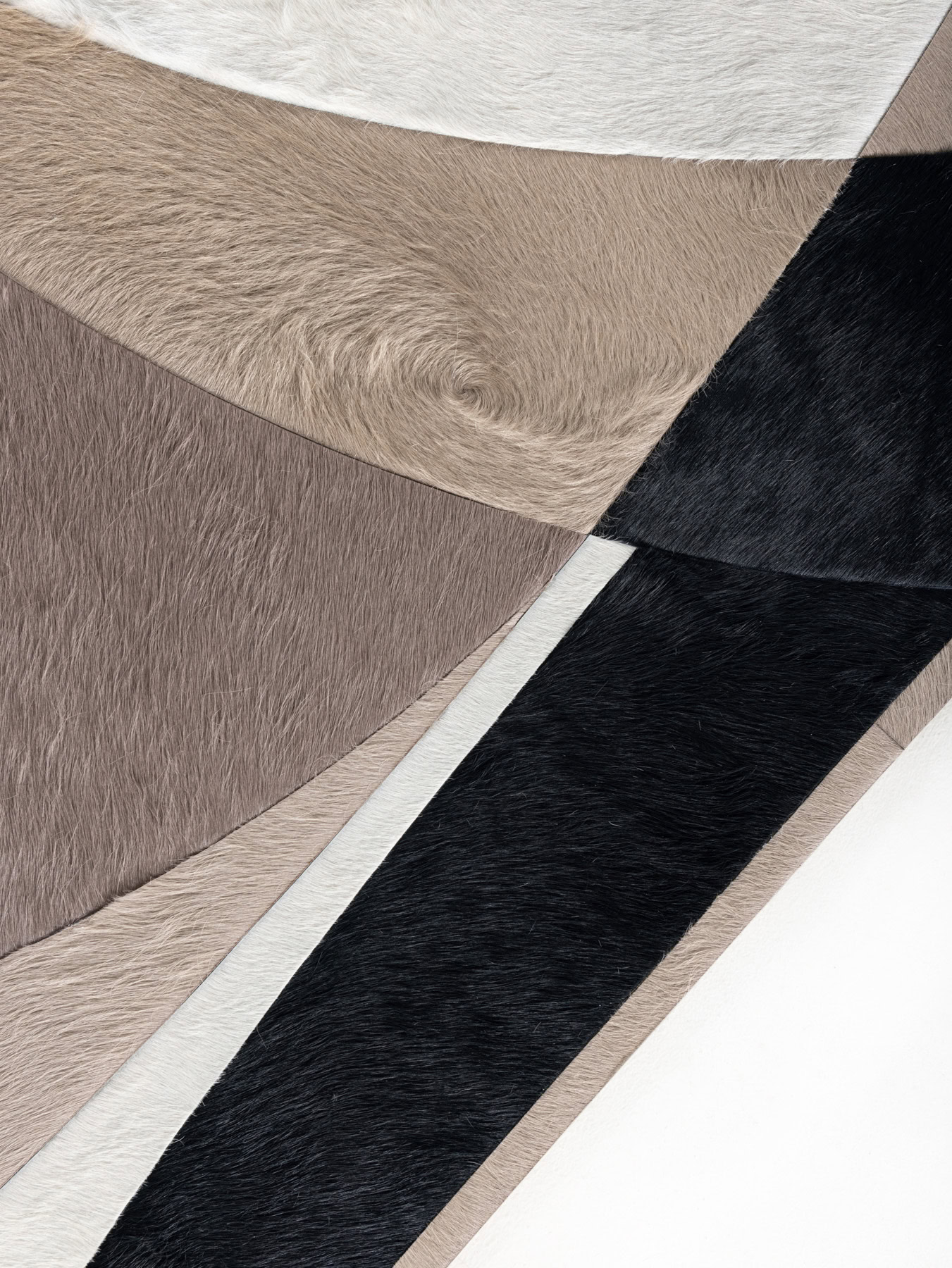 Popularly conceived as a round rug, Luna evokes the image of a craterous moon in the night sky. Large cuts of hide are carefully placed, creating the individually stylistic and organic shapes that give Luna balance and congruity.