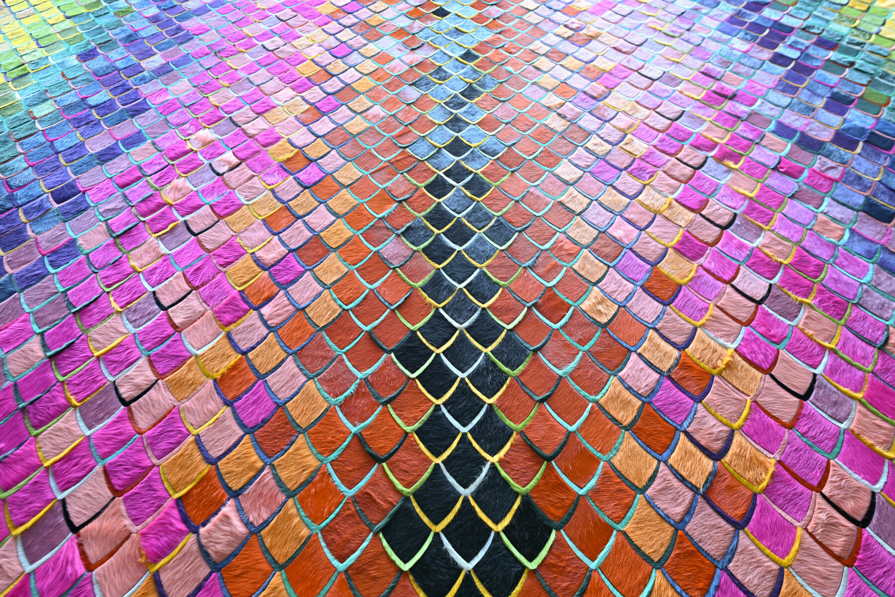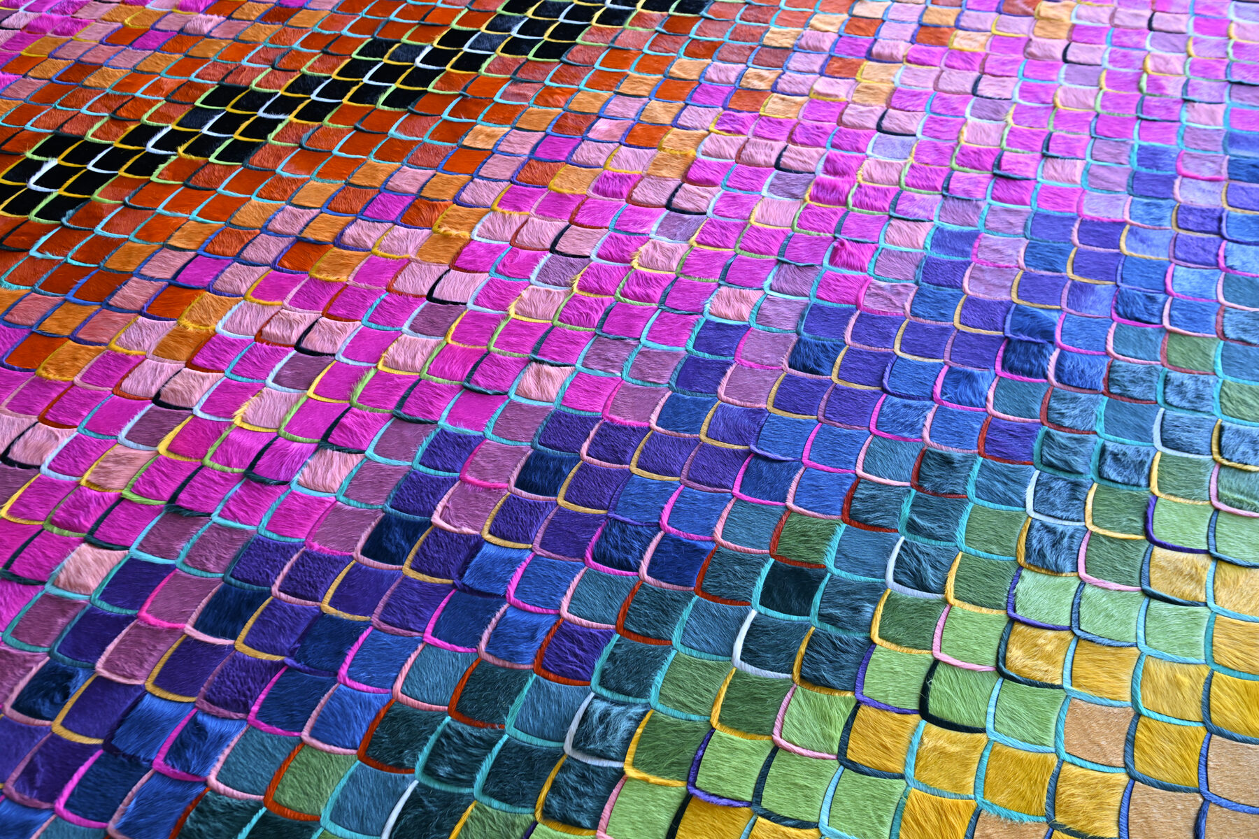 Inspired by nature, Slither encapsulates the distinguishable markings of serpent scales through simple repetition of piecework, color placement, and the natural texture that only hair-on cowhide can create. By including a narrow accent on the tip of each scale, Slither allows for extraordinary depth and dimension when showcased in complementary color gradients.