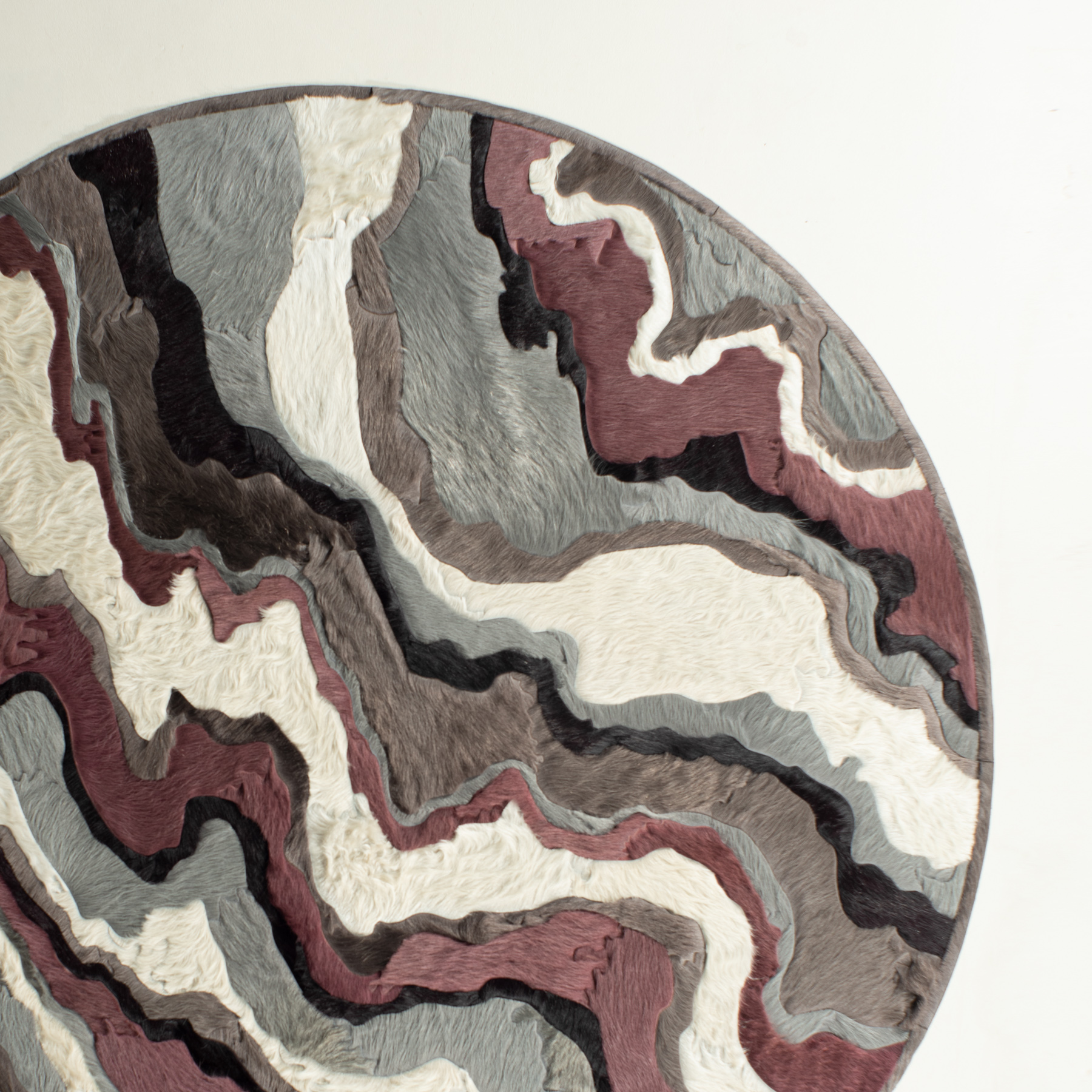 Through extreme heating and cooling, magma builds, overflows and cumulates, creating the varying widths and depths of the Earth’s soil and rock. Submerge emulates these layers by using various organic shapes of hide that seem to shift and move as they flow from the design’s central core.