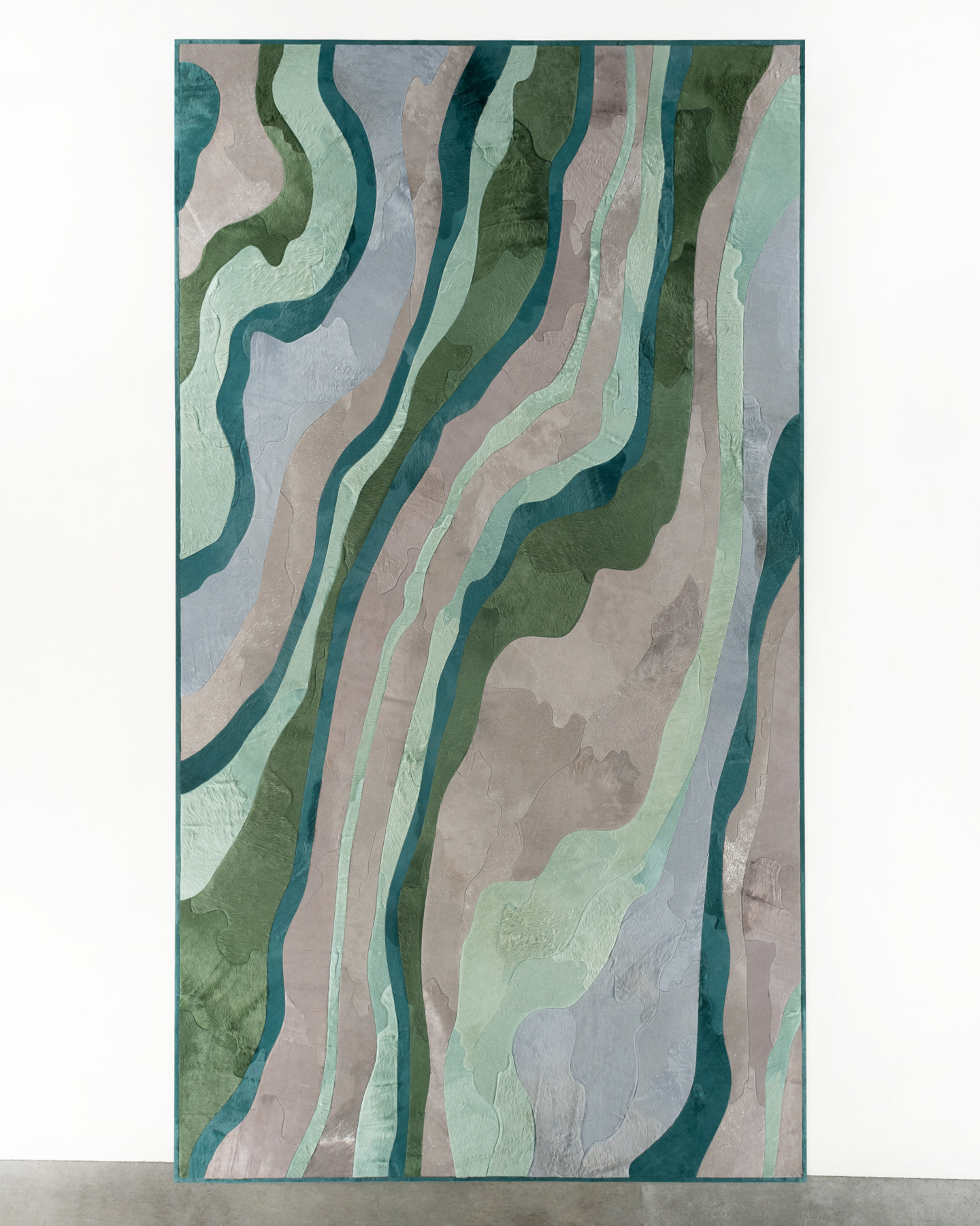 Through extreme heating and cooling, magma builds, overflows and cumulates, creating the varying widths and depths of the Earth’s soil and rock. Submerge emulates these layers by using various organic shapes of hide that seem to shift and move as they flow from the design’s central core.