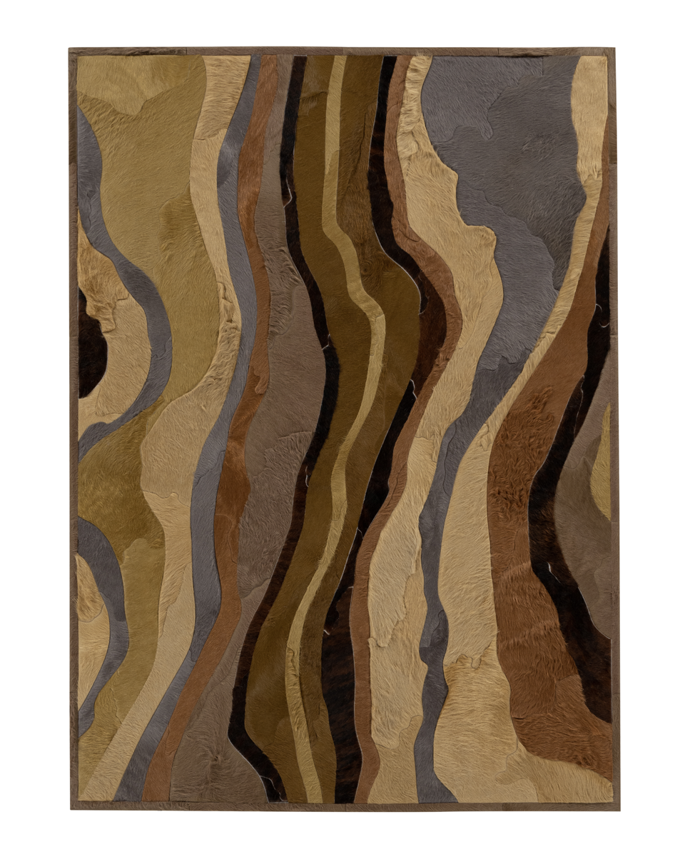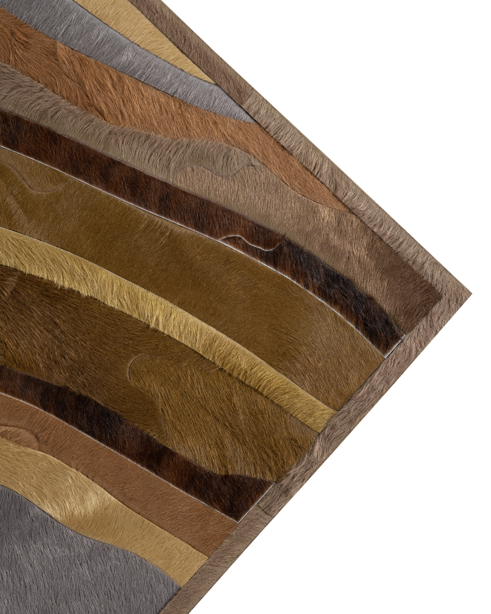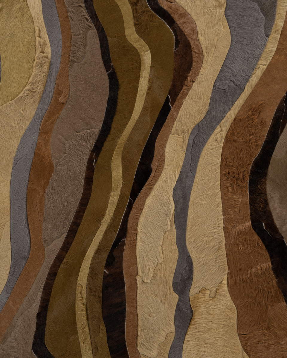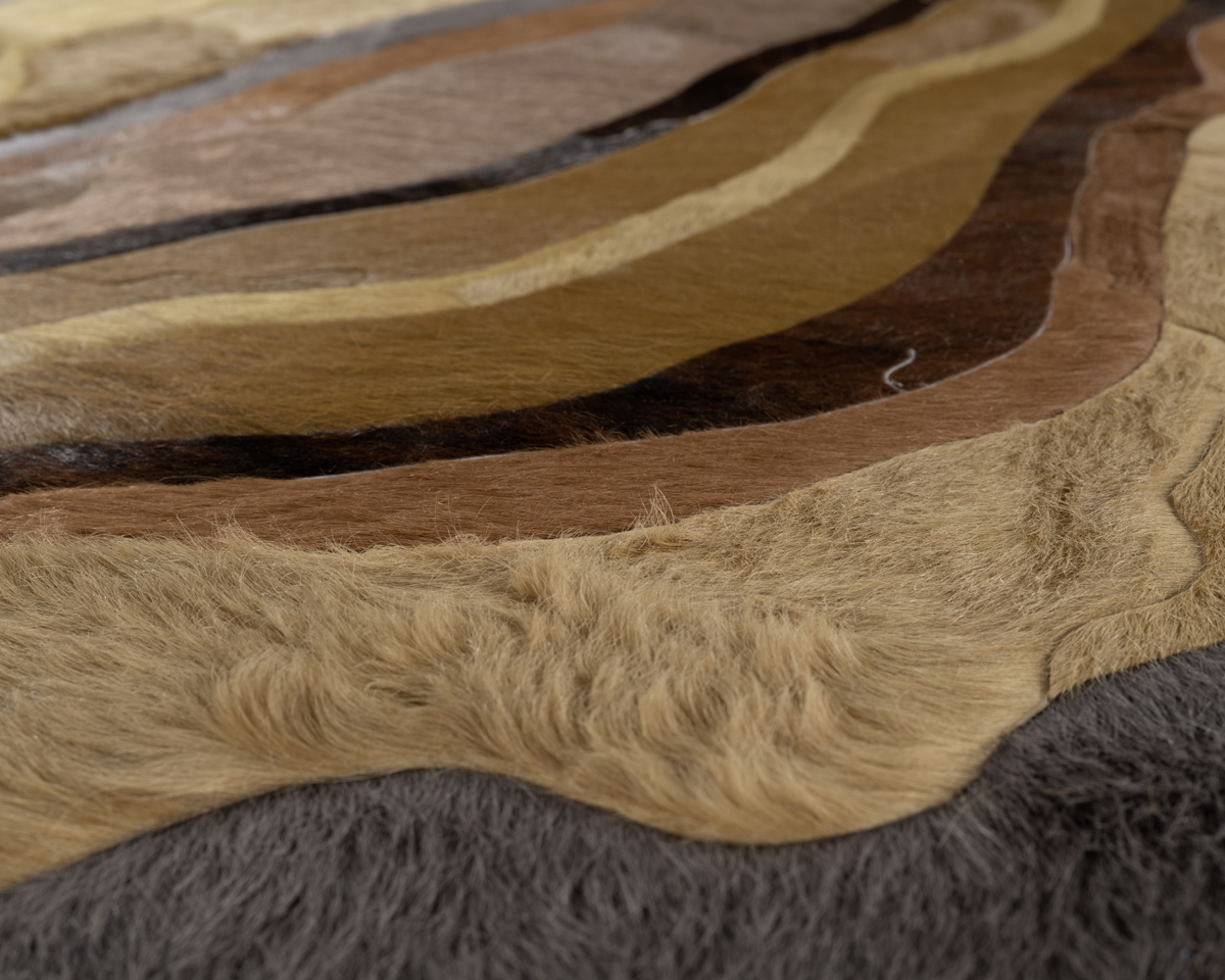 Through extreme heating and cooling, magma builds, overflows and cumulates, creating the varying widths and depths of the Earth’s soil and rock. Submerge emulates these layers by using various organic shapes of hide that seem to shift and move as they flow from the design’s central core.