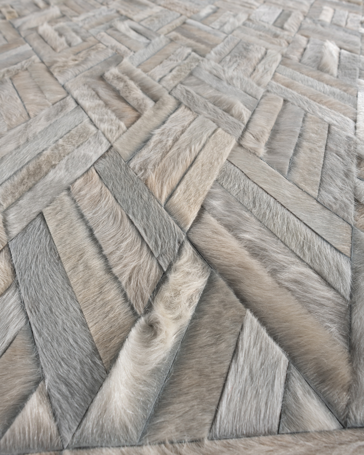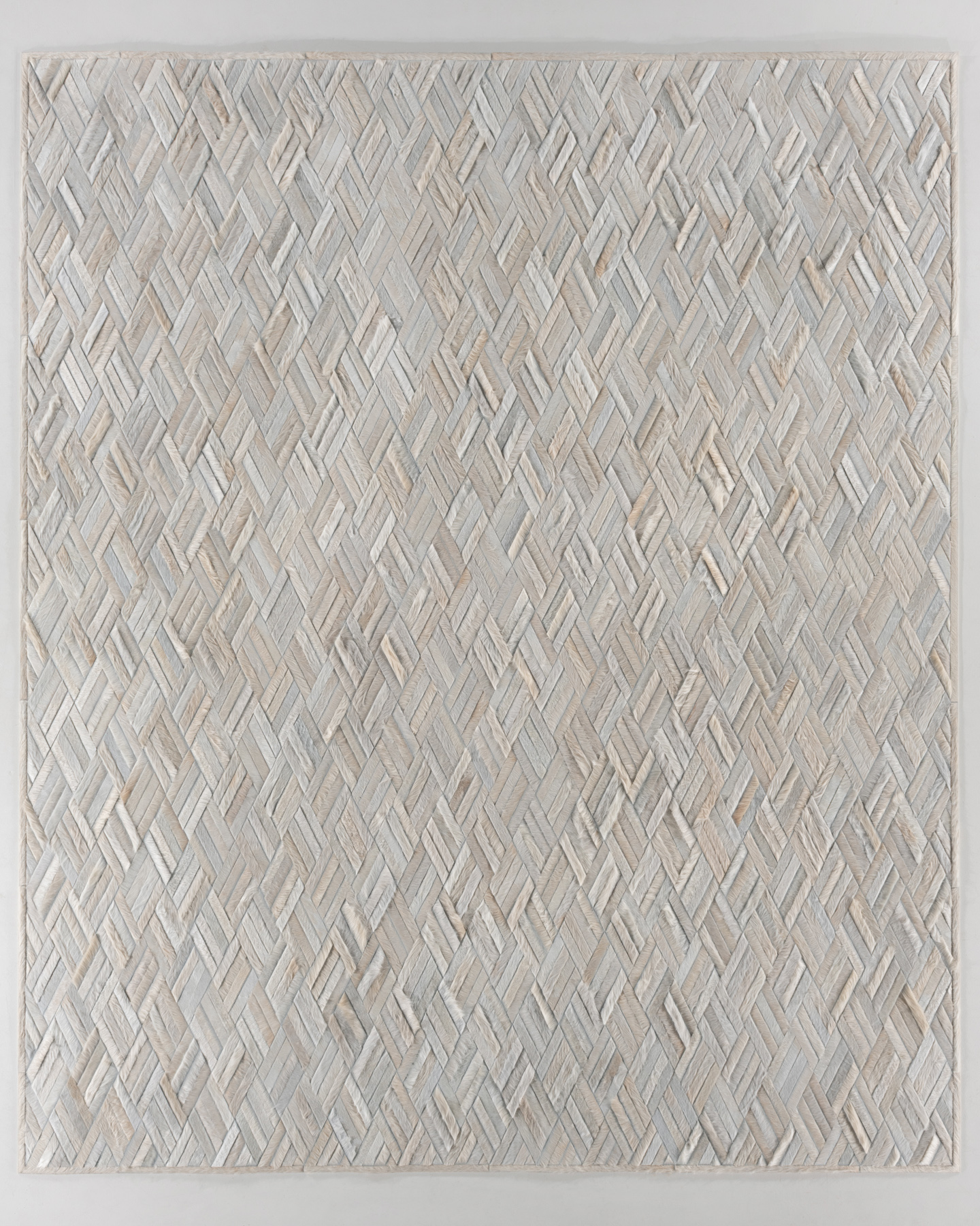 Composed of long, fluid bands of hide, Swell alludes to the movement of waves in the ocean. This water-like design is created with contrasting 1” ripples that give the organic pattern an air of contemporary stylization.