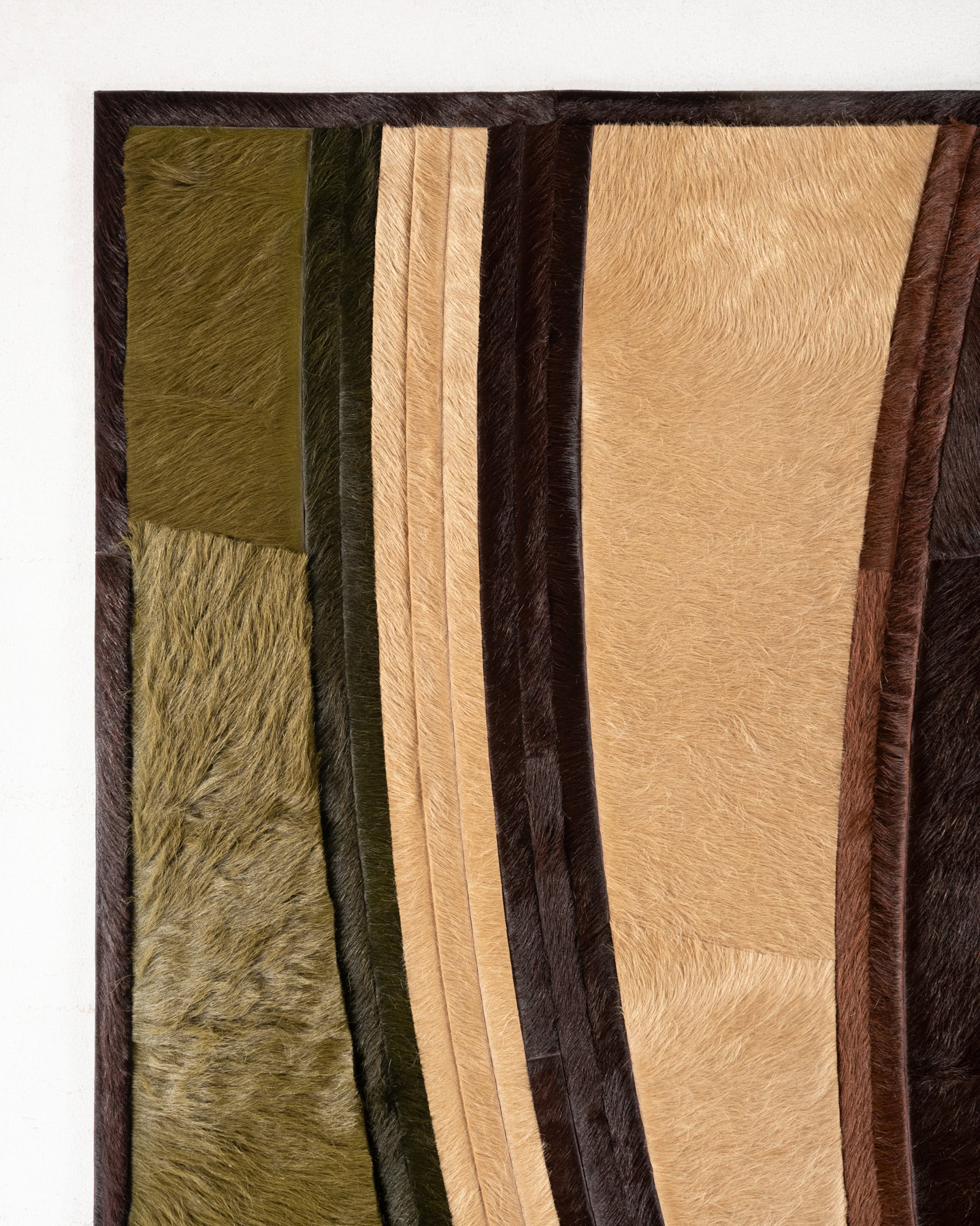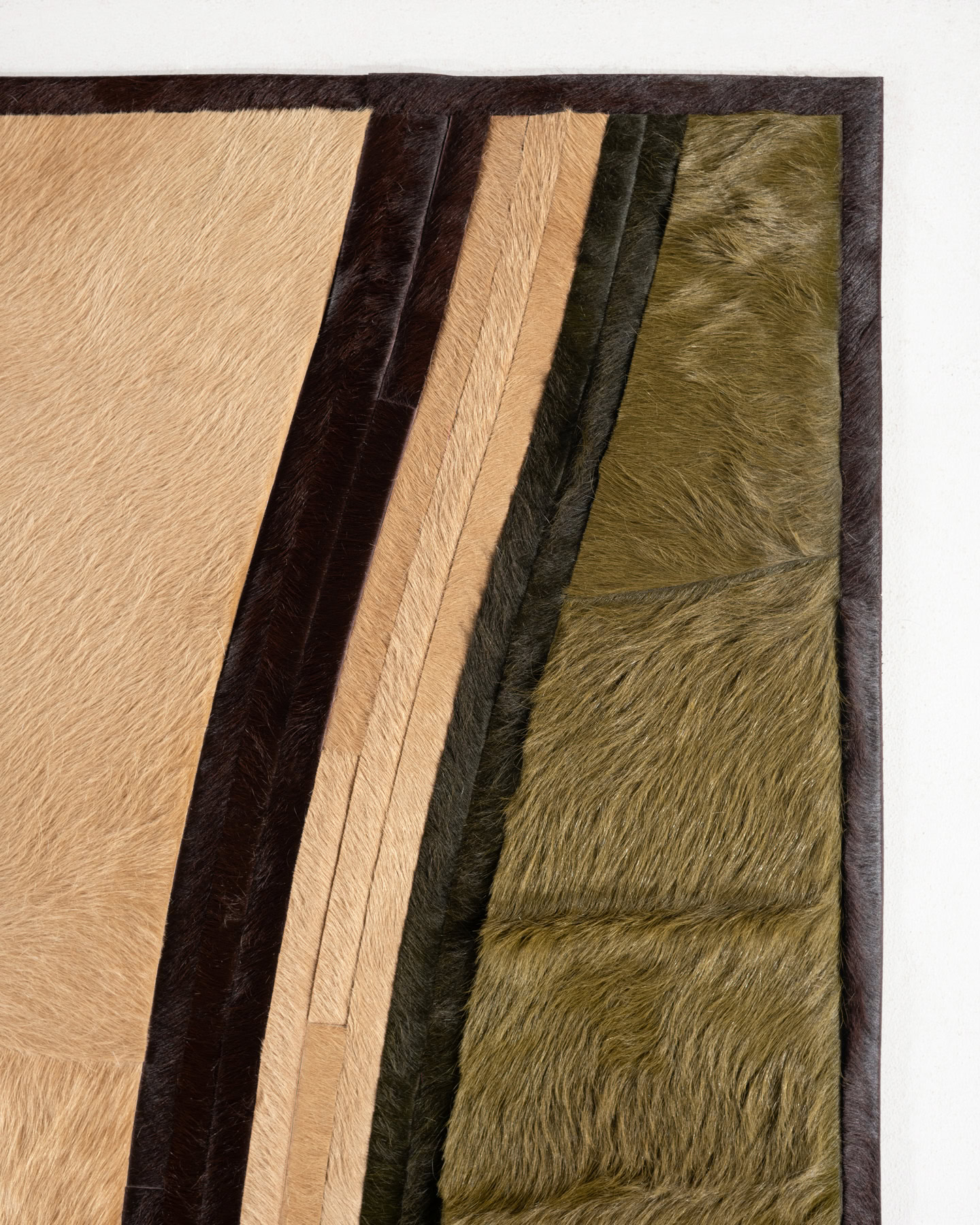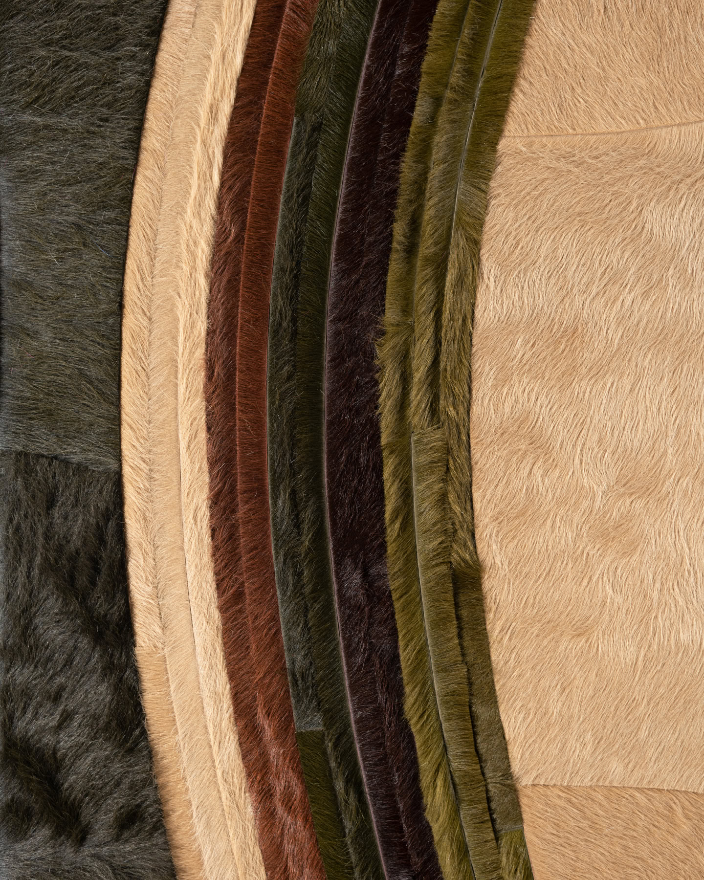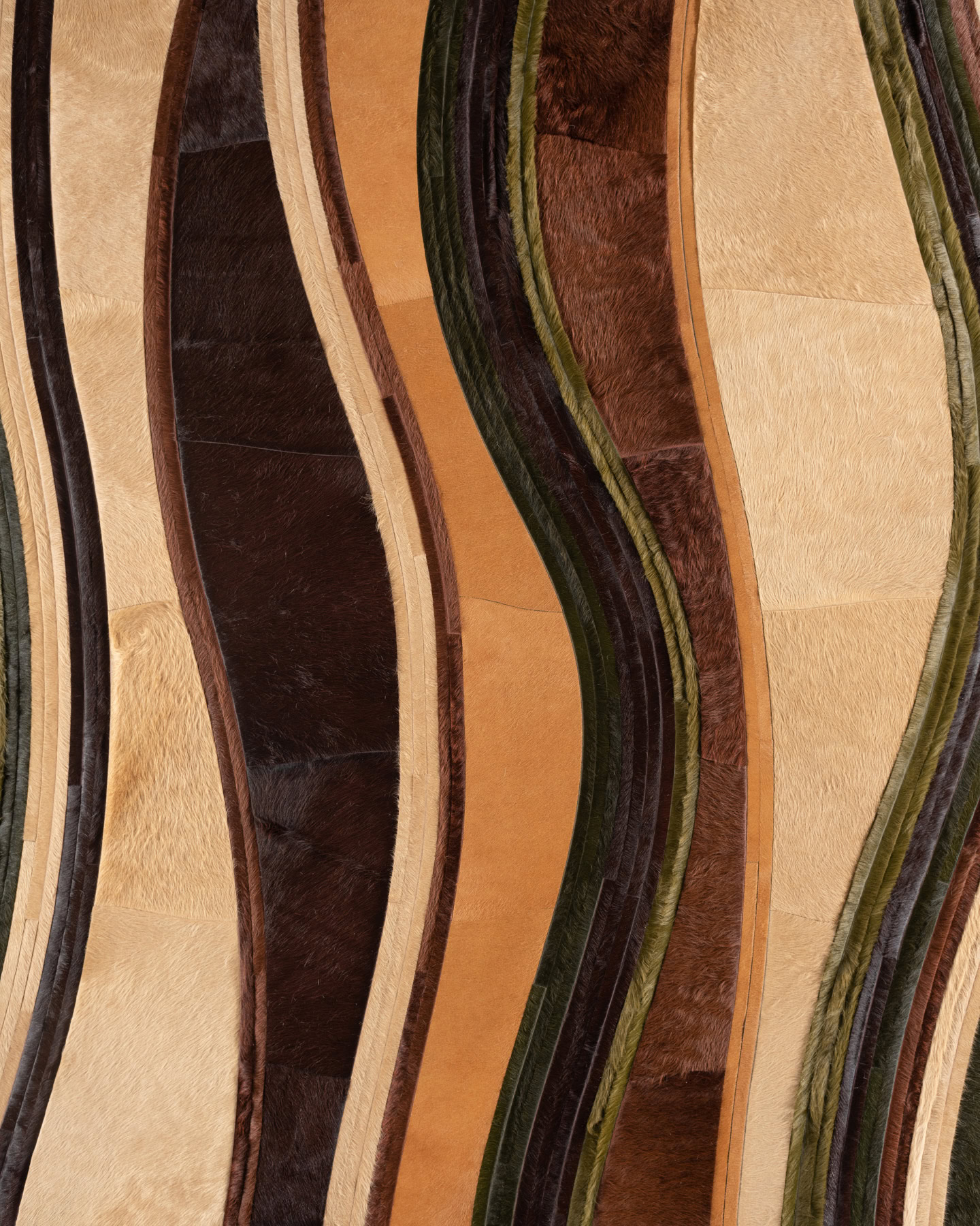 Composed of long, fluid bands of hide, Swell alludes to the movement of waves in the ocean. This water-like design is created with contrasting 1” ripples that give the organic pattern an air of contemporary stylization.