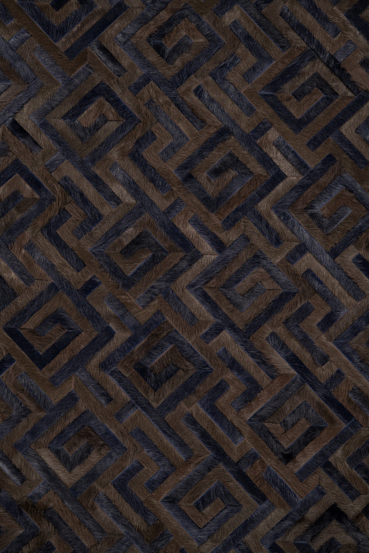 Turnkey unlocks the artistic potential of the Greek fret through a fresh, contemporary design application. Using strips of hide pieced in tightly-wound, geometric shapes, Turnkey emulates the infinitely complex twists and turns of ancient labyrinth structures.